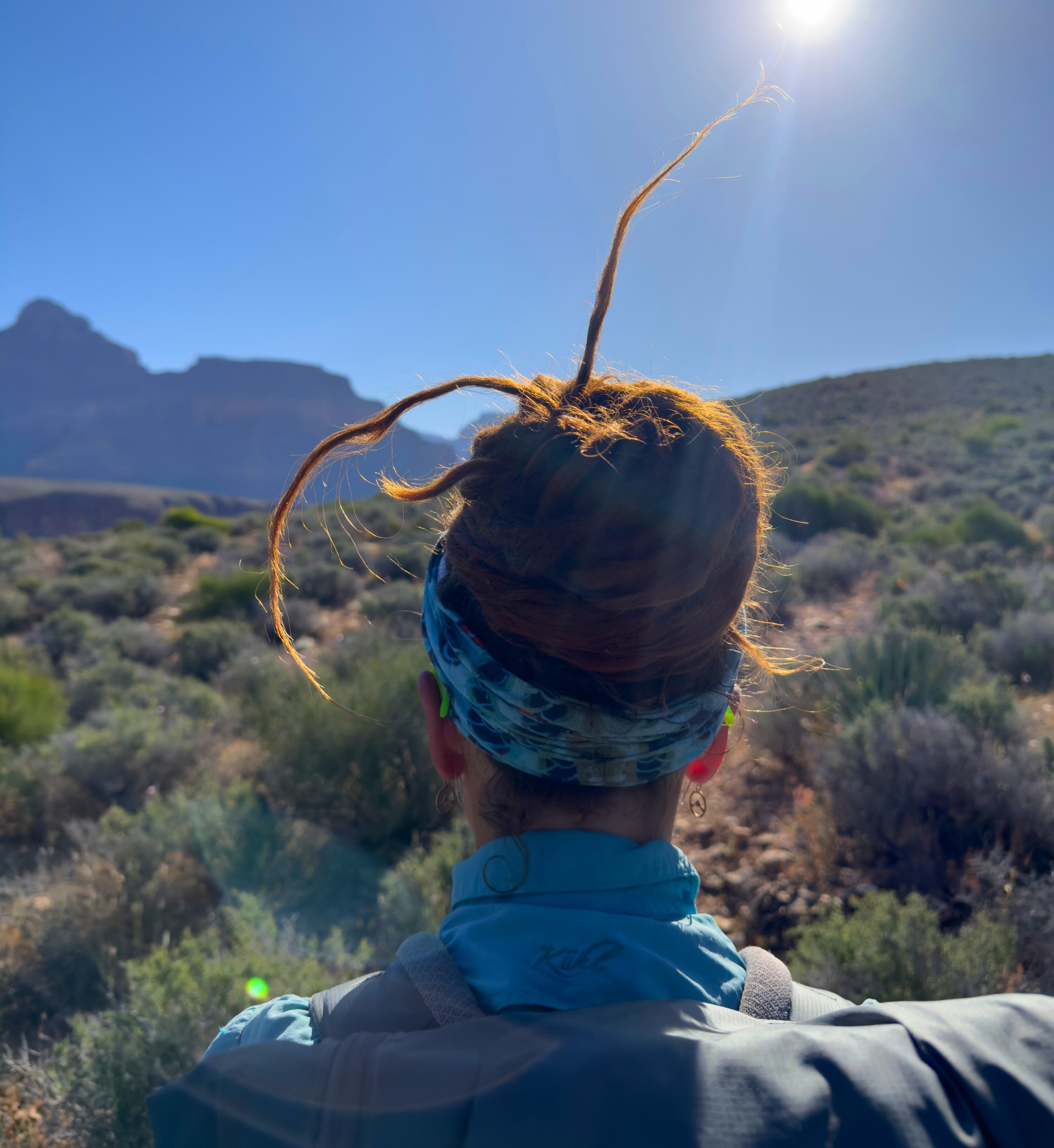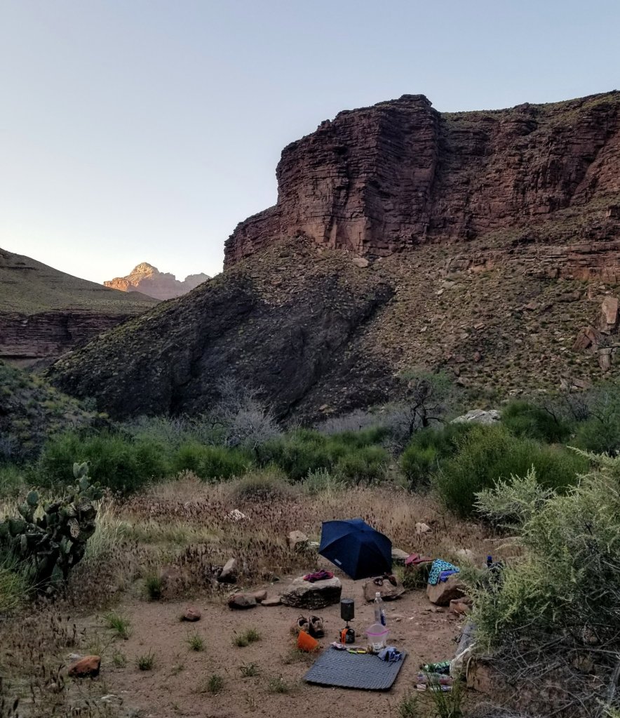 By the time the clock reaches 1:30pm we are still in the groove of moving but still have not stopped for lunch. There is simply no shade anywhere but we scout around and try getting creative with the landscape. Thus we atttempt to duck under some rock ledges that have the teeniest sliver of shade but it doesn’t work at all. Rockin gets attacked by stickers in her sit pad and I can’t get my umbrella to stay in place to save my life. We finally ditch the spot and continue on for another half hour, eventually stopping in the broad sun right on the Tonto platform. We need to eat, like now.