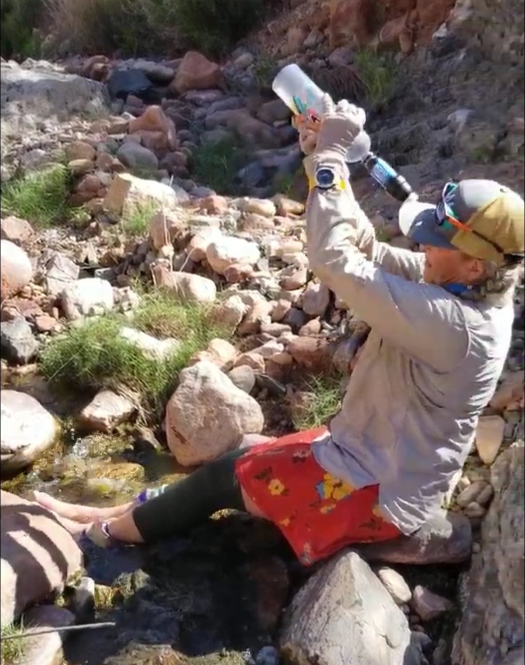 Thus she has started wearing my compression socks for protection and I can’t believe she can stand how hot they are probably making her. Her new strategy is to pour water on them which is brilliant, never thought of doing that! Actually, the new strategy is to pour water on everything. It’s good we carried extra, super helpful as this place is surely not made of shade.