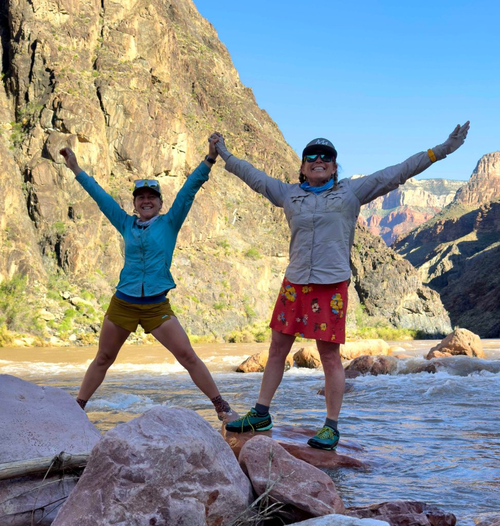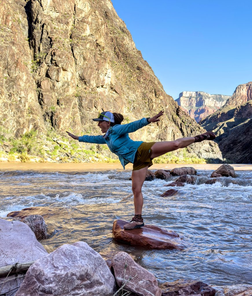 We reach the River and it is raging. The speed of the water is unreal, I’m not sure if it is usually this fast? Could it be running faster? It is a force I tell you. The breeze with the mist spraying feels like air conditioning, it is so good! We hang out on the rocks on the edge of the River in silence. I get as close as I can to the rapids to feel their power. Palpating the energy of the water moving incessantly through the canyon, I wind up thinking about how it has been doing this for thousands of years without ever stopping. I never can seem to wrap my mind around that. Nor can I wrap my mind around the bedrock here being 1.6 Billion years old. It hurts my brain yet I believe there is something inherently purifying about being in this energy field. I am so grateful we came down here.