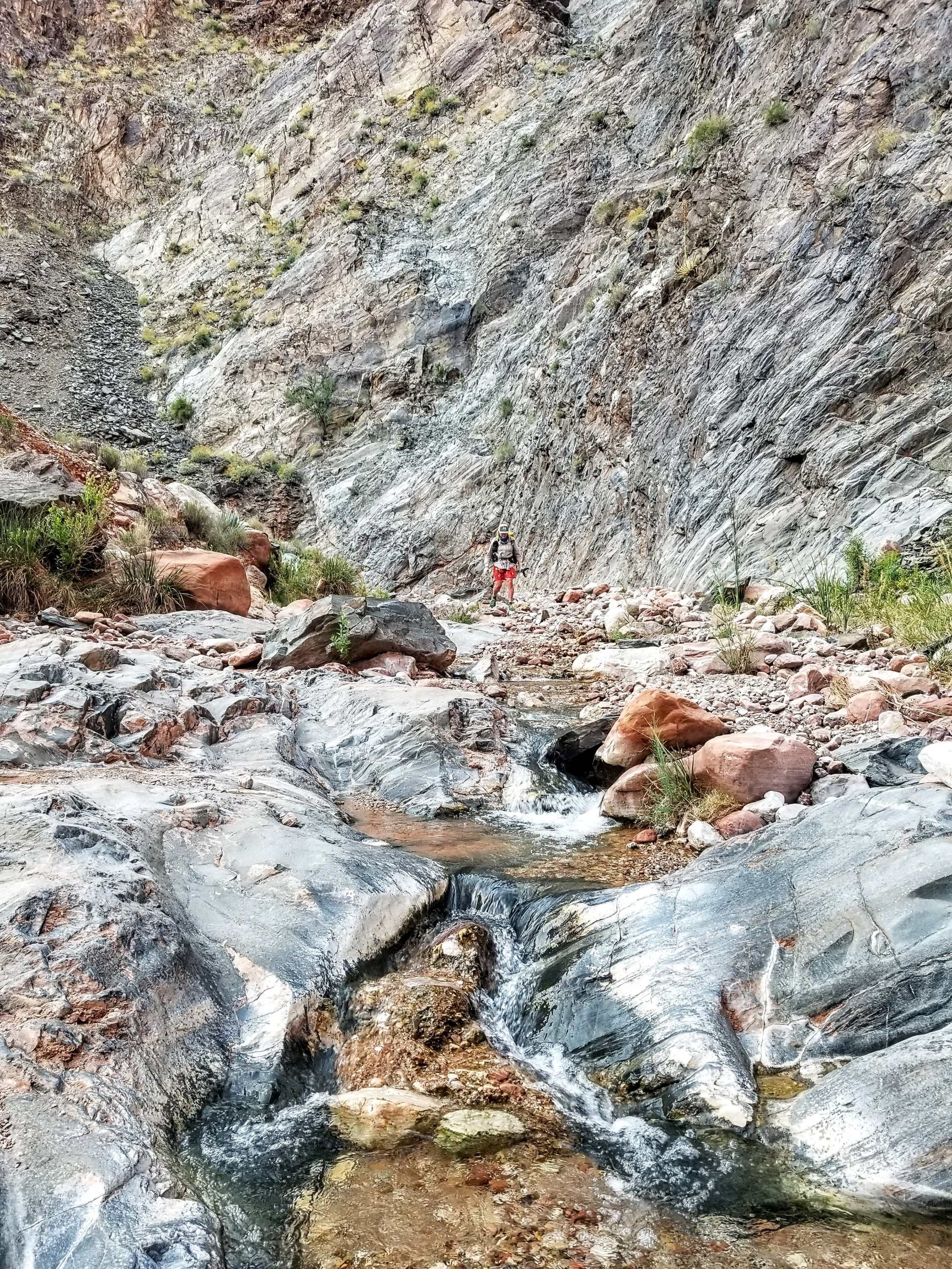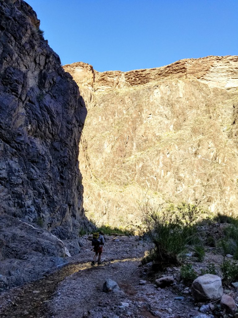 Once we have cooled down a bit, we set off again with our first goal to make it to our first water source at Slate Canyon. We have to cross Agate Canyon along the way, which is such a lovely canyon but has zero water. Agate has some interesting rock formations and a few scraggly mesquite trees that are just budding out. Thankfully we drop back into some shade created by the steep canyon walls that still hide behind the morning sun, so we get to walk in some shade for a bit. We are trying to absorb as much shade as we can, if absorbing shade is a thing you can do.