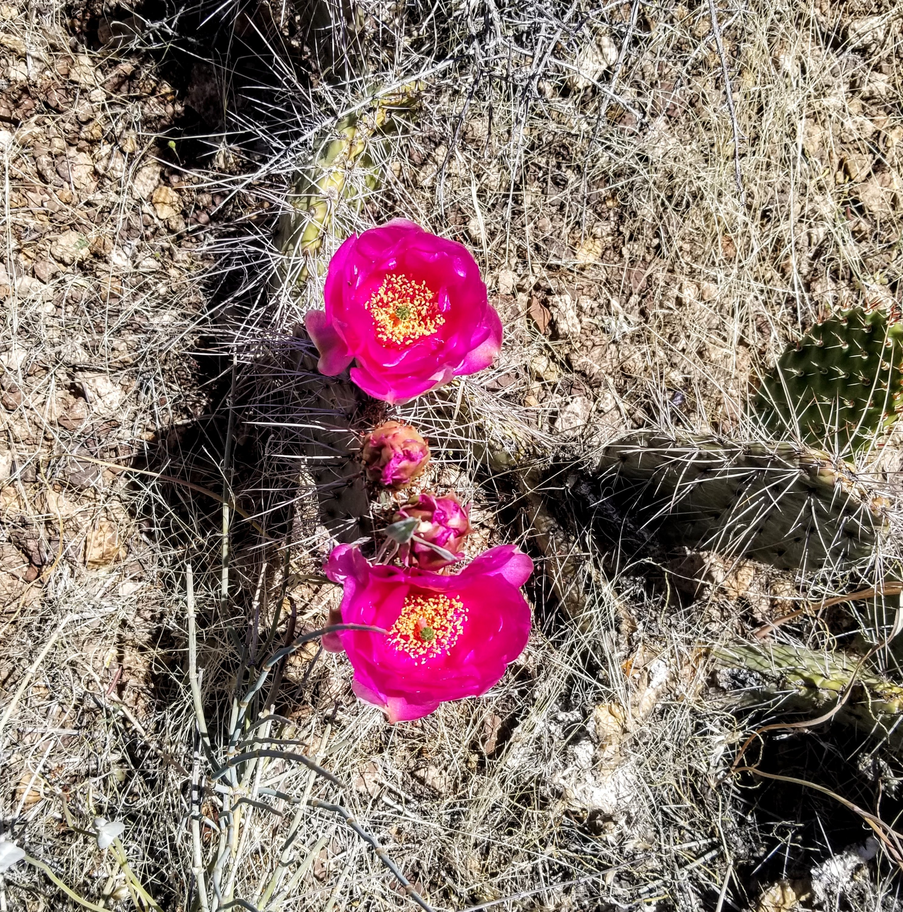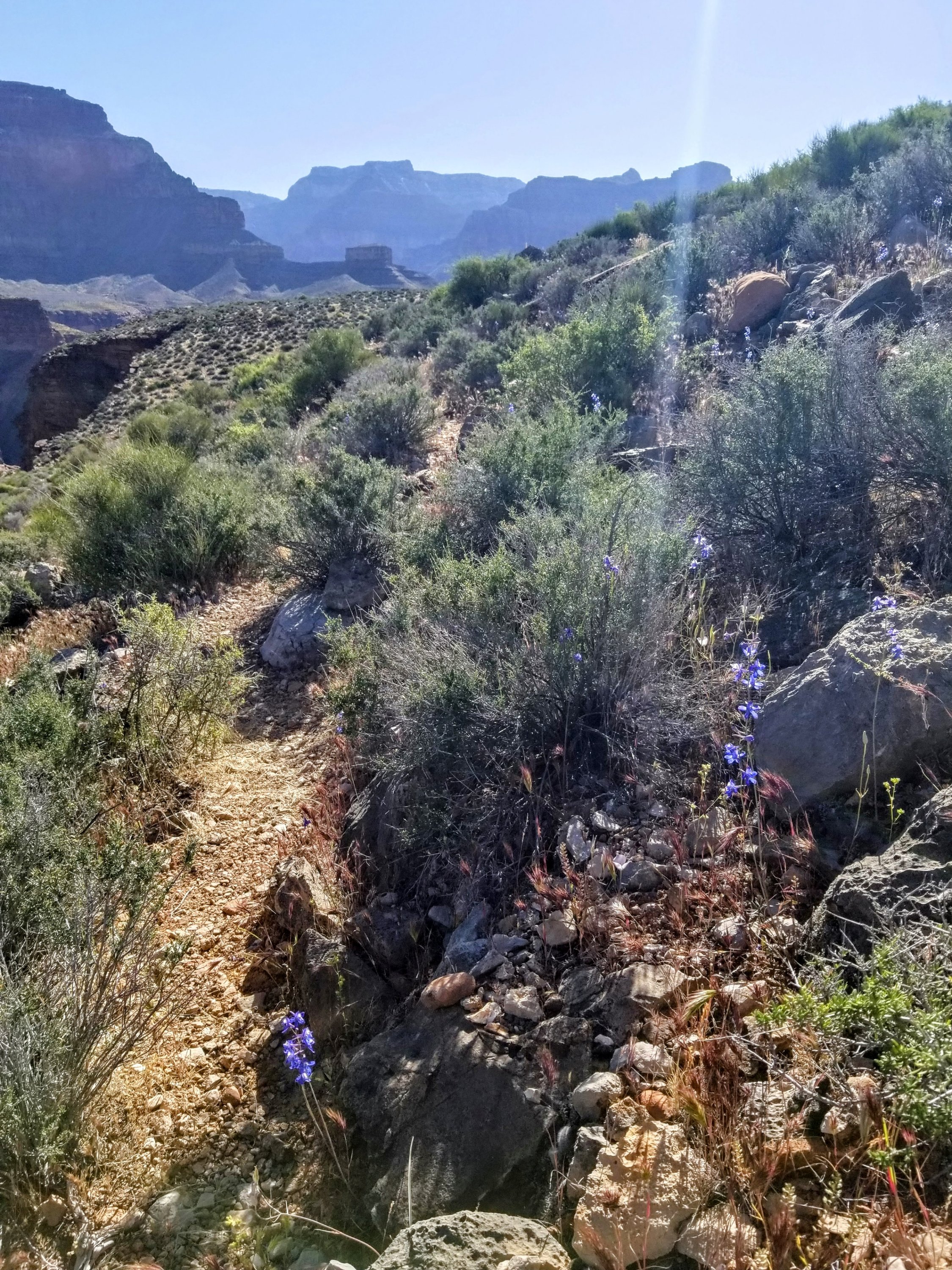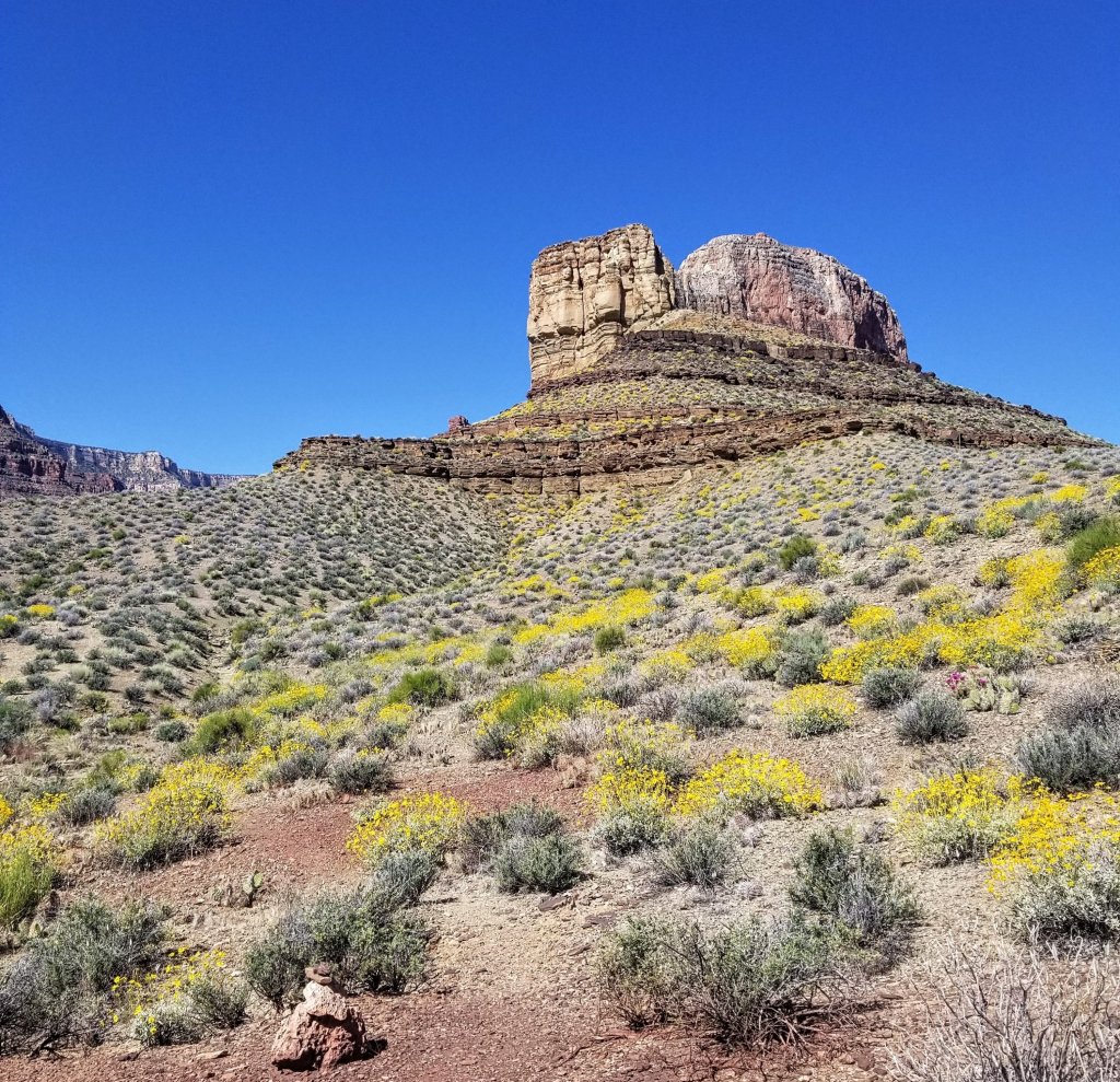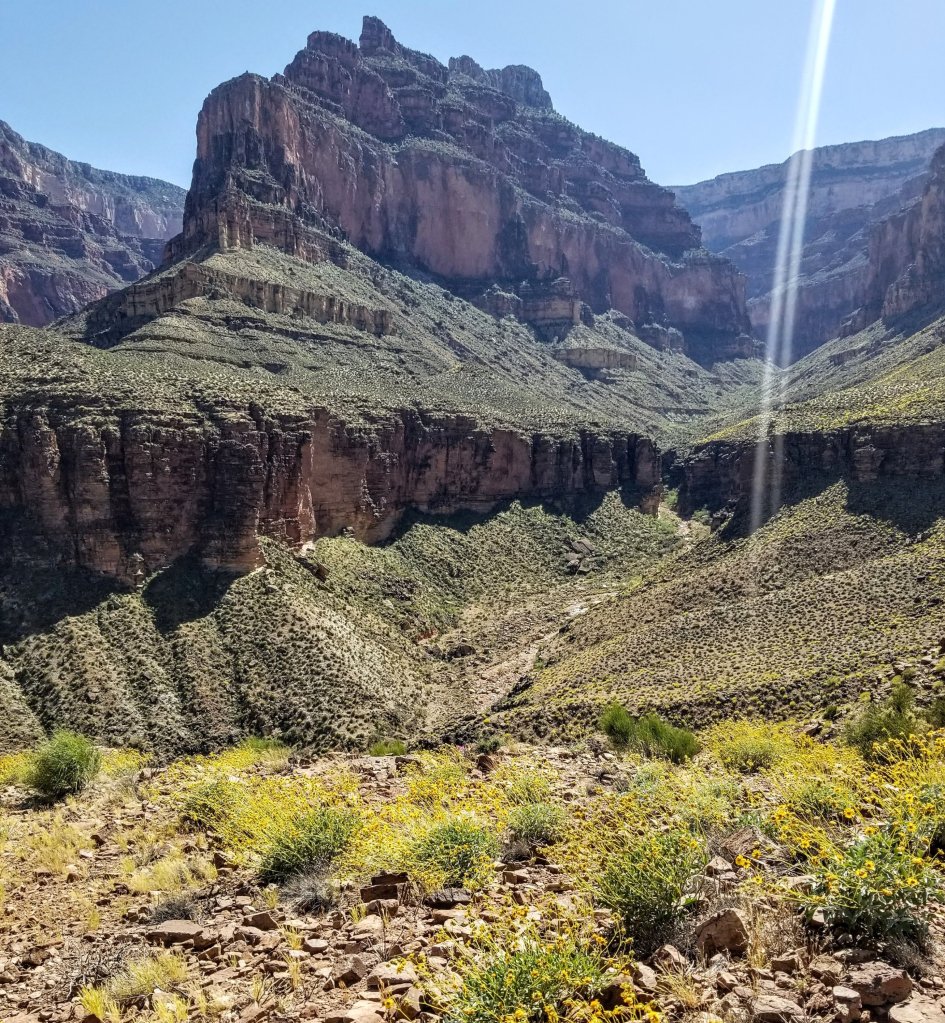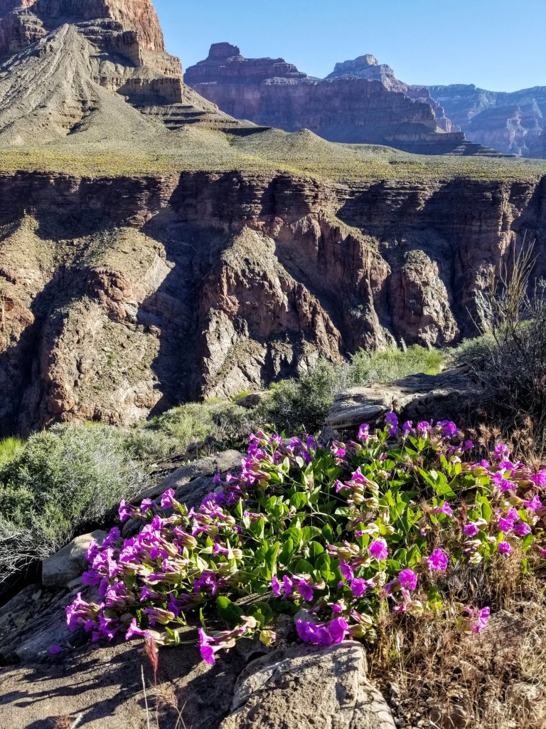 Out on the Tonto platform the rays of sun are already quite intense at 8:00am. Rockin takes out her shade umbrella early, but I wait as long as I can to take mine out cuz it’s a bit of a nuisance to carry. Today we are taking note of the bubble gum 80’s neon pink color of the Prickly Pear cactus. Seriously, where does this pigment come from? There are also Century plants about to burst with flowers, and a purple flowering plant called Four O’ Clock’s that seem extraordinaly happy on the rim over looking the River. This isn’t normal! I have been saying this over and over again the past few days. All these flowers and their intensity of pigmentation is not your standard Grand Canyon experience, all this water is not normal. This is such an exceptional year.