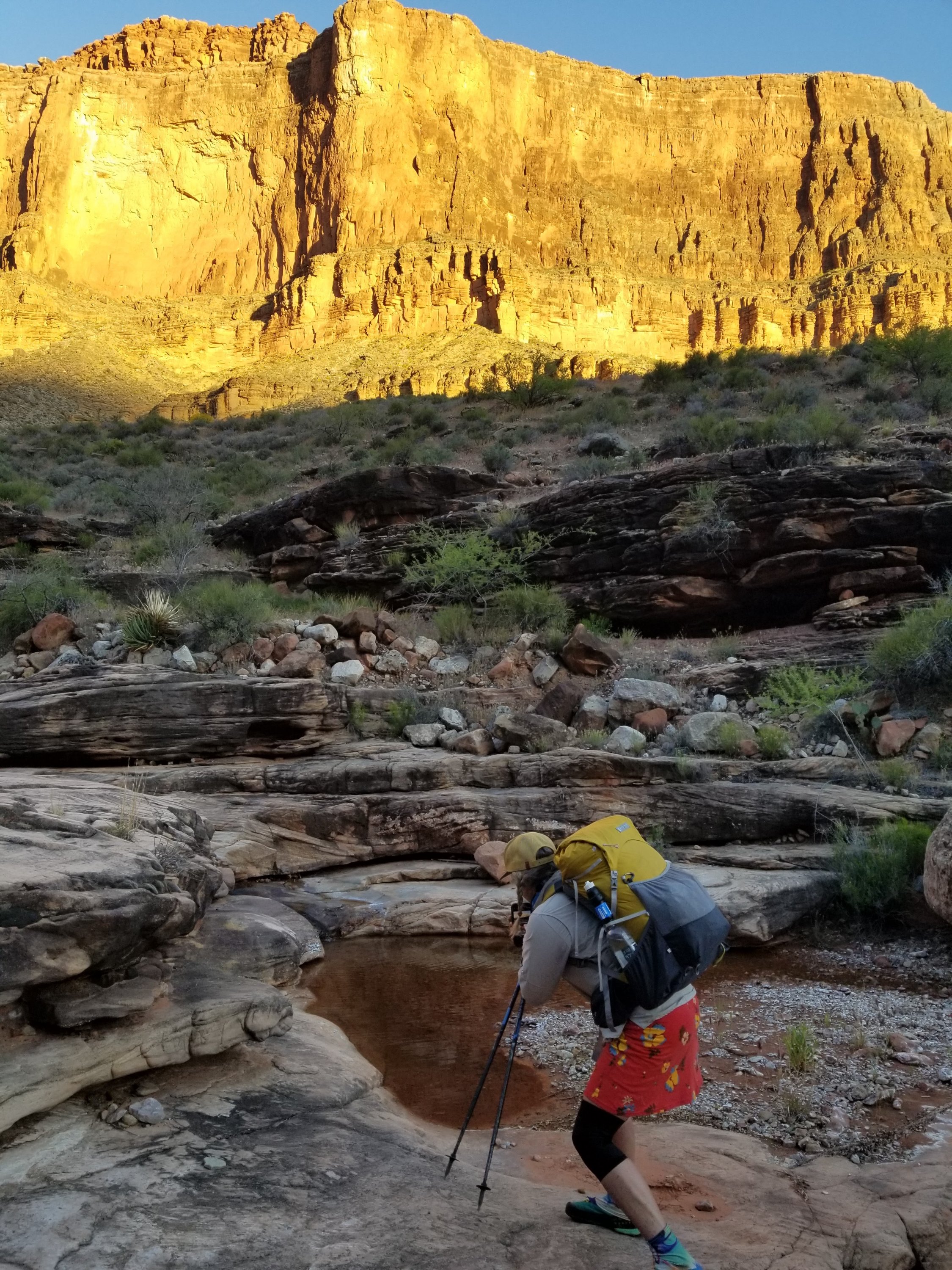 When we make it to Slate there is water right where the Tonto crosses, hooray! It is easy to find some perfect little pools for cooling off and scooping up. Here, we meet Silver Bullet, another Hayduke hiker. She is sitting in the one shady spot that exists here and we three crouch into it’s space. We sit for like an hour chatting, drinking and eating. I make my second coffee of the morning as it is 10:20am and I feel ready for it. Then I gorge on nuts and chocolate chips, like a total gorge fest. I shouldn’t have hiker hunger just yet, so I am pretty sure I am about to bleed, darn hormones. My head feels the way you do when you have been crying, but I haven’t been crying, it’s super odd, so it must be the good ol’ hormones shifting. My low back aches like nobody’s business too and I’m pretty sure it’s not the new backpack. Ugh, can we just do this?