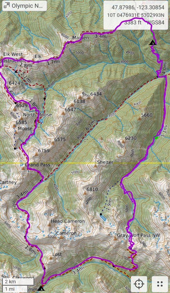 1.) A 44 mile loop starting here at Deer Park camp, heading down the Three Forks Trail to Gray Wolf Creek and then Gray Wolf Pass to the Dosewallips River and Dose Meadows. From there I will hang a steep right, headed North up to Lost Pass and Cameron Pass/Cameron Basin. After a long drop to Cameron Creek I will then climb up to Grand Pass and camp at the pass on my third night. My final day will follow the trail past Badger Valley and connect to Obstruction Peak TH at the end of that road. The following 8 miles will fall on the PNT Alt, along Deer Ridge, leading me back to my car. So that’s hike #1.