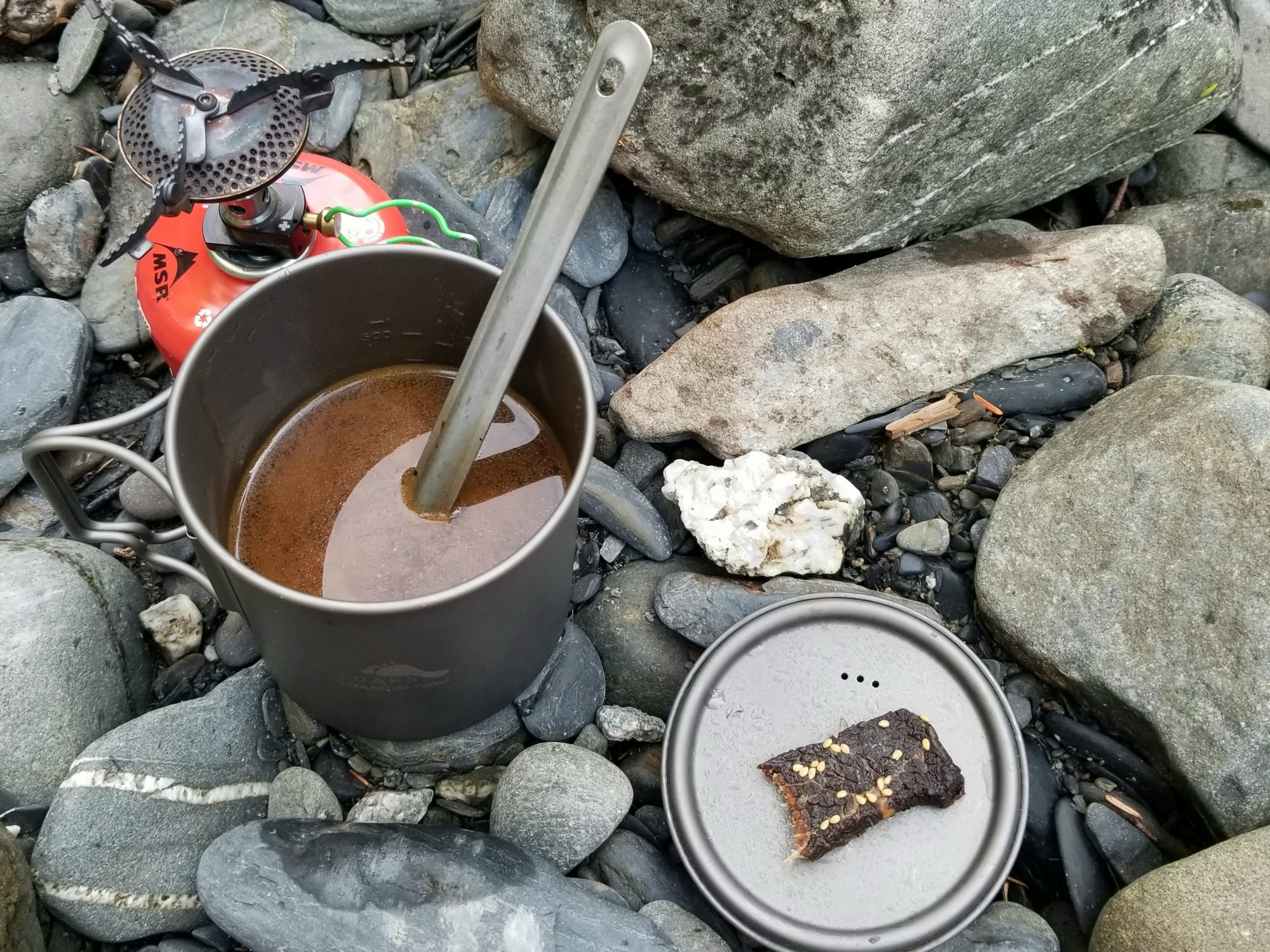 Eventually I am rewarded with a peek through the dense forest at some of the high peaks that surround me, sending waves of excitement rippling through me. I am looking forward to the climb! That beef jerkey and coffee got me through around five miles, that is pretty good, but before the climb I need another snack. It’s 1:30pm and theoretically a good time to eat lunch, but I have my heart set on that pass. I stop for water at a creek, make electrolytes and eat a Greens Plus bar with a chunk of dark chocolate. I see a trail runner cruise by on the log bridge, he is in shorts and a t-shirt and wearing what looks like a Solomon running vest. Cool! I wonder what he is up to?