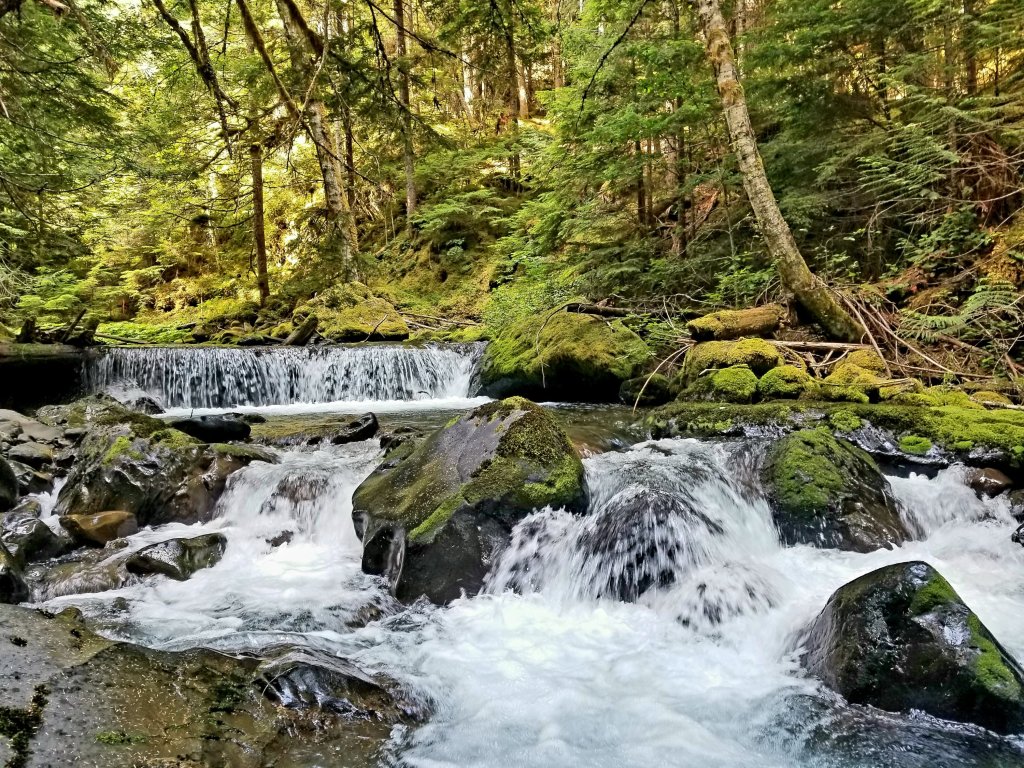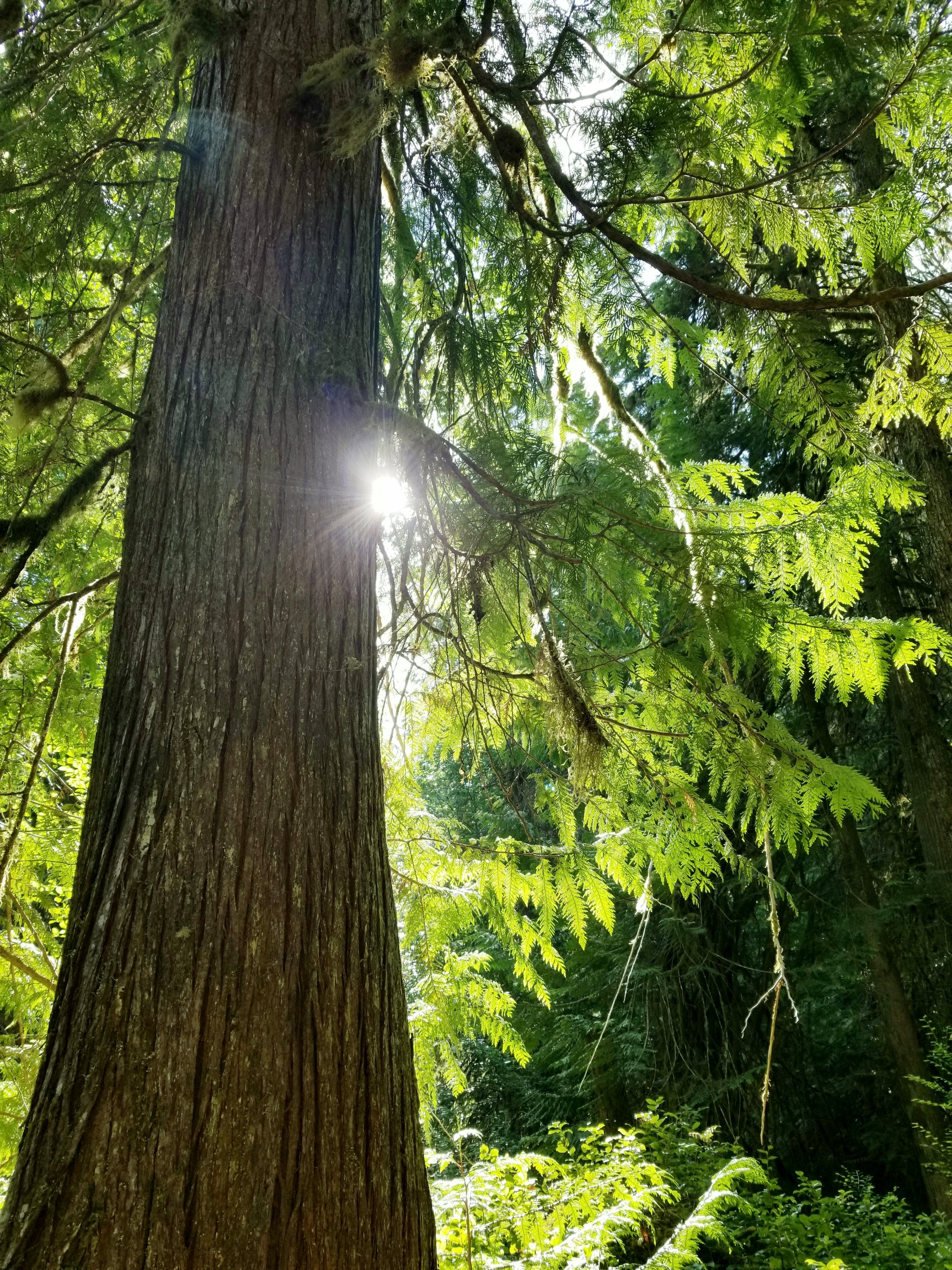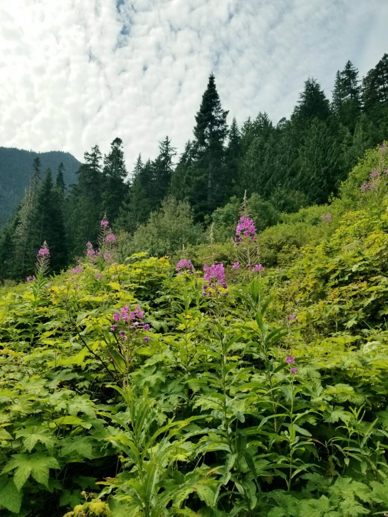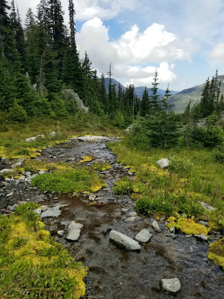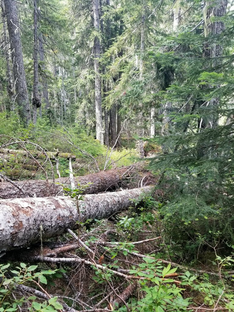 The soil here is spongey and very forgiving on the joints, it is lovely and the trail makes several long contours and switchbacks to get down the mountain. I am buried in thick vegetation and a myriad of conifer trees, I don’t even know what all of them are but for sure there are Cedar, Hemlock, Spruce. This forest is thriving and it is such a blessing to be walking among miles and miles of land covered with such a lush forest. It is it’s own living, breathing self and I get to witness it’s pulsing, heaving and sighing the breath of life.