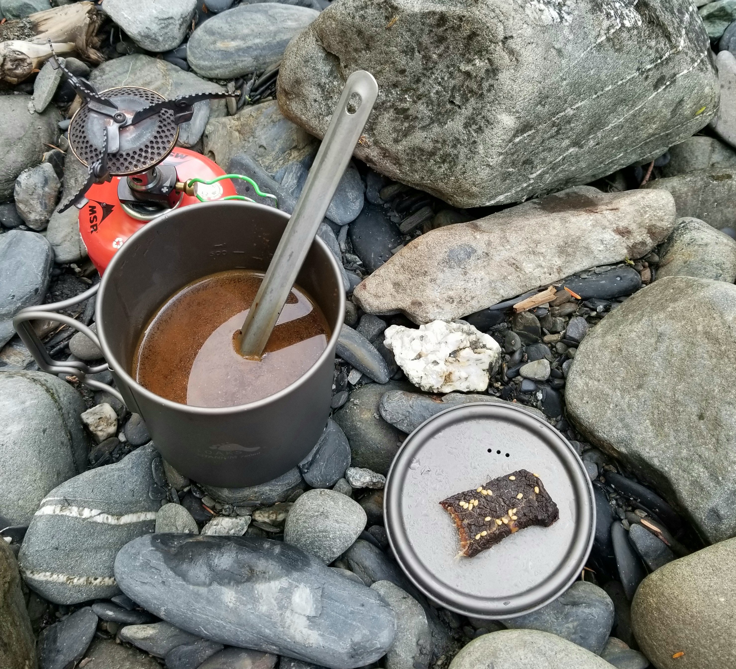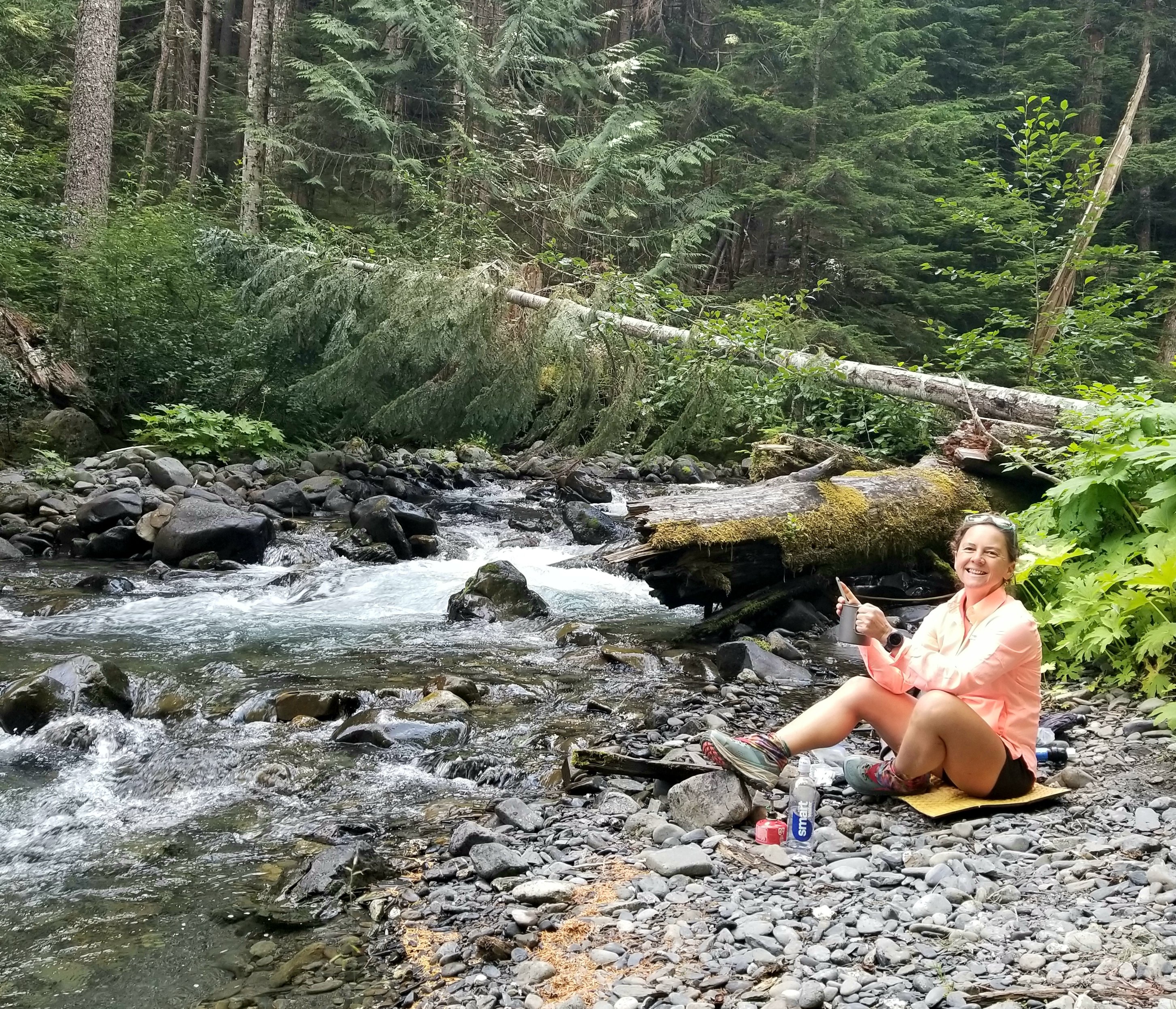 It is truly beautfiul here and it’s a treat to bear witness to nature doing her thing. Water is crashing over rocks and fallen trees making artful cascades worth admiring. Little mosses and flowers grow on top of decaying wood, sheltered by fattening leaves that soak up the sun. I am cruising along and feel great, making solid progress. My mental game has been in race training mode, in that I am aware of my pacing and mileage on the regular, though not obsessively. I want to make it to mile 5 before taking a snack and 2nd coffee break, though at mile 4 find the perfect spot along a creek. I take the bird in the hand.