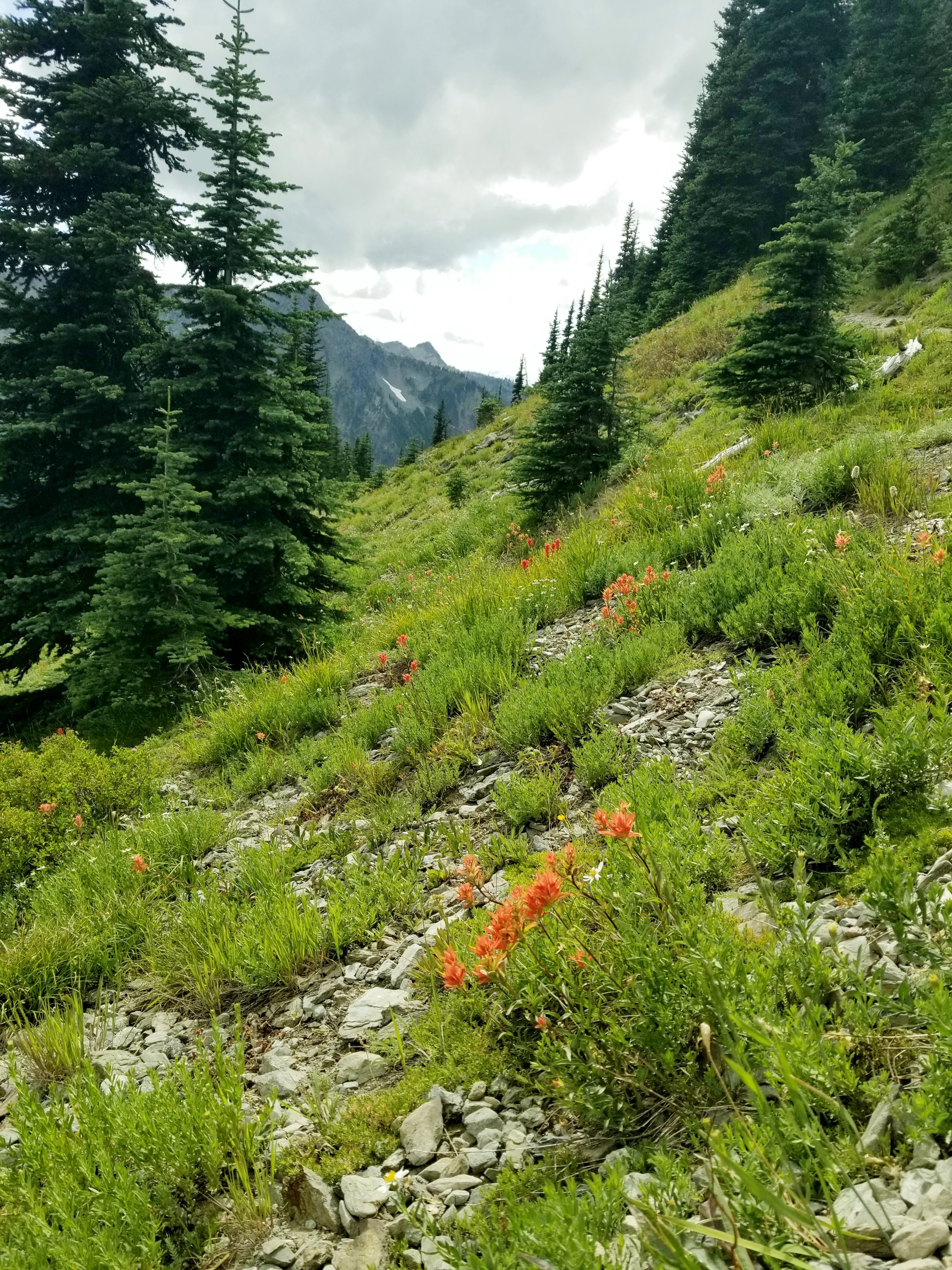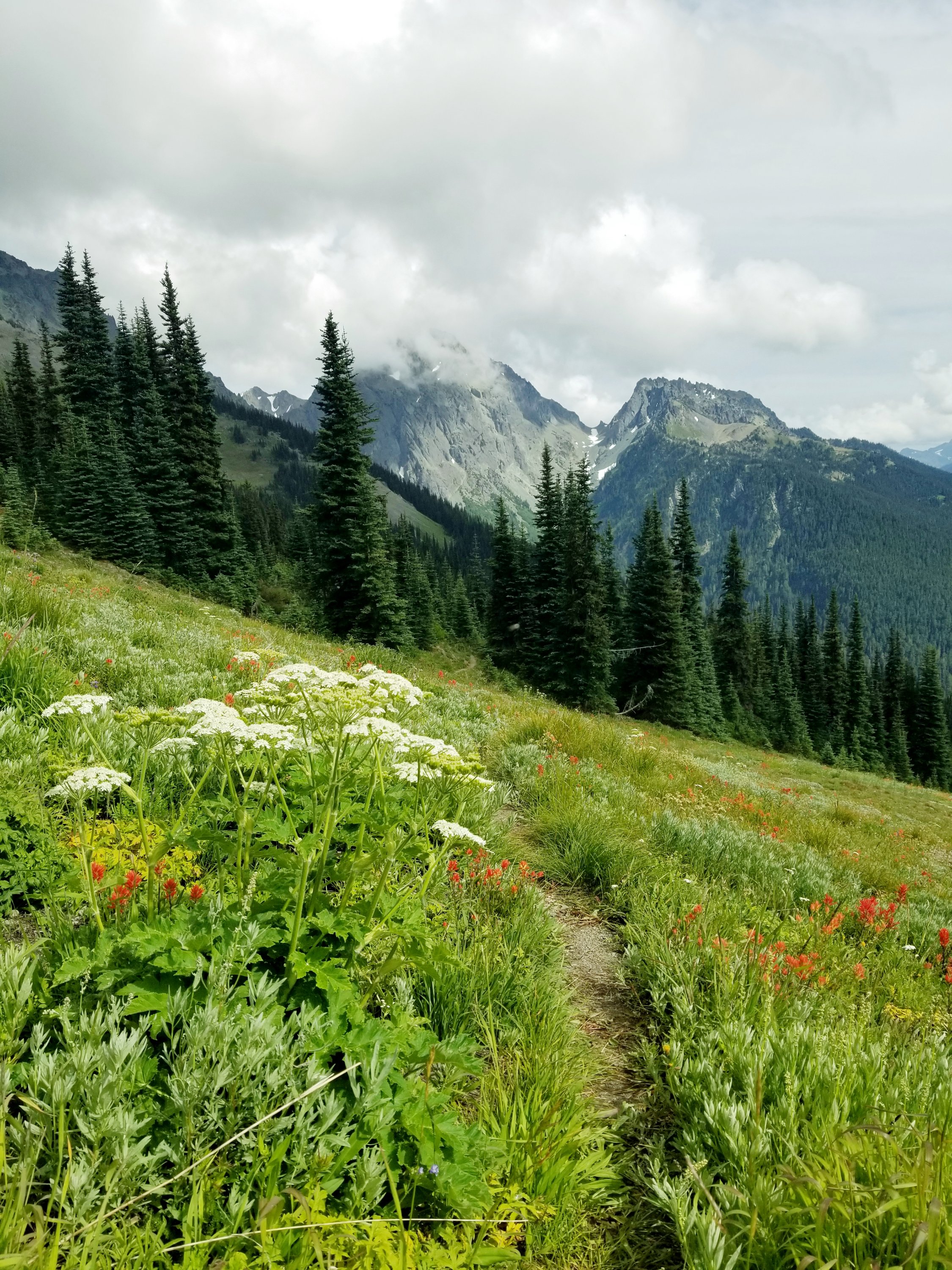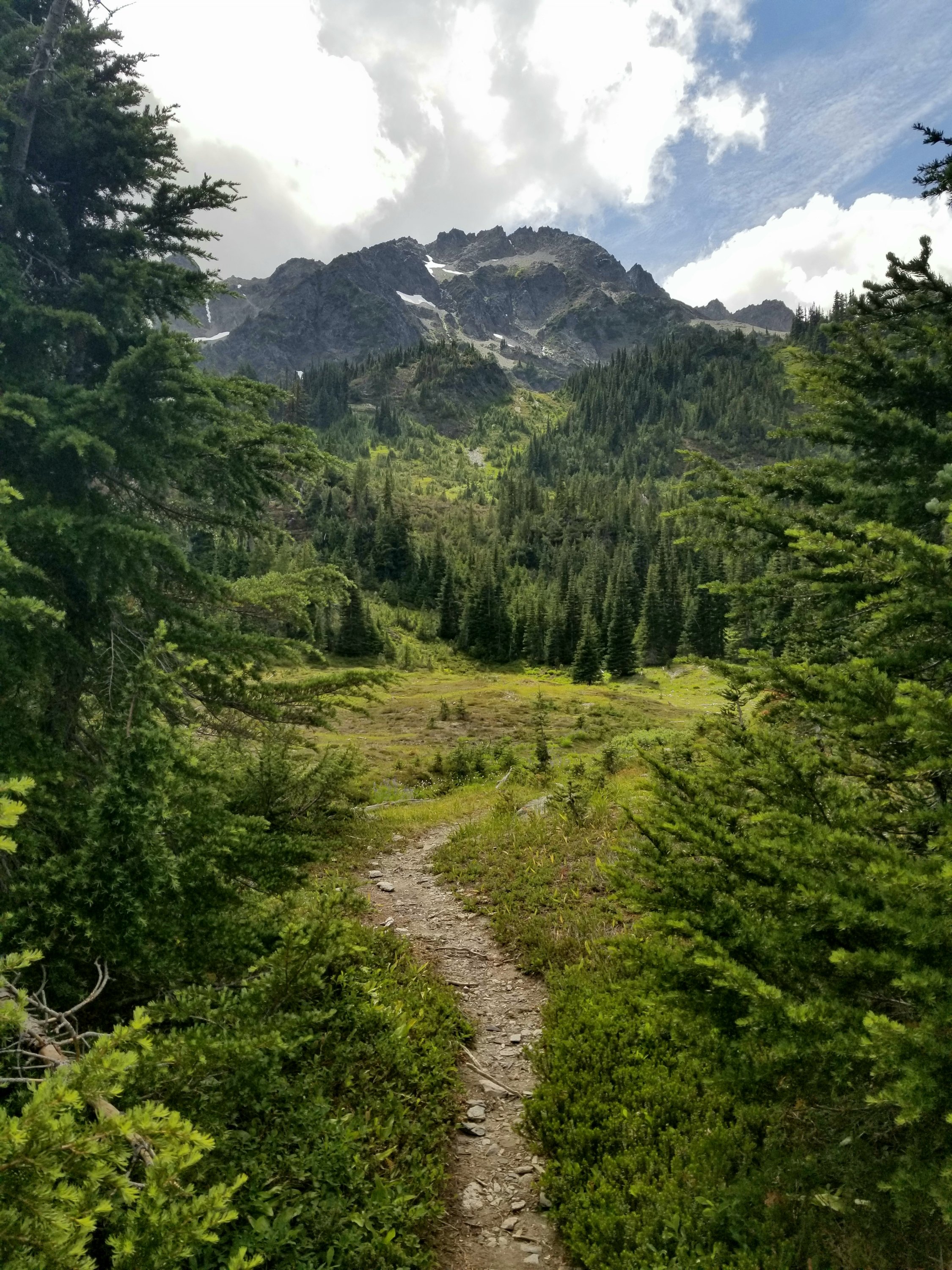 I am fueled and ready for this 2,800 ft climb. My watch says I have already ascended 1,900 ft which didn’t even really feel like much climbing over that last 6 miles, now it is going to be felt for sure over a much shorter distance. As I break through the trees into the sub-alpine zone the rewarding views and change of scenery are truly a gift, as this is what I  came here for. Not that I didn’t love the forest, but I really love the veiws of all the high peaks too. They look menacing with their sharp and jagged lines, their remaining snow fields with the clouds lingering around their toothy edges are such a contrast of soft and hard.