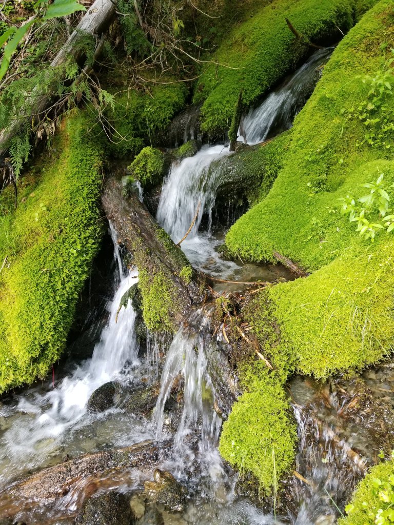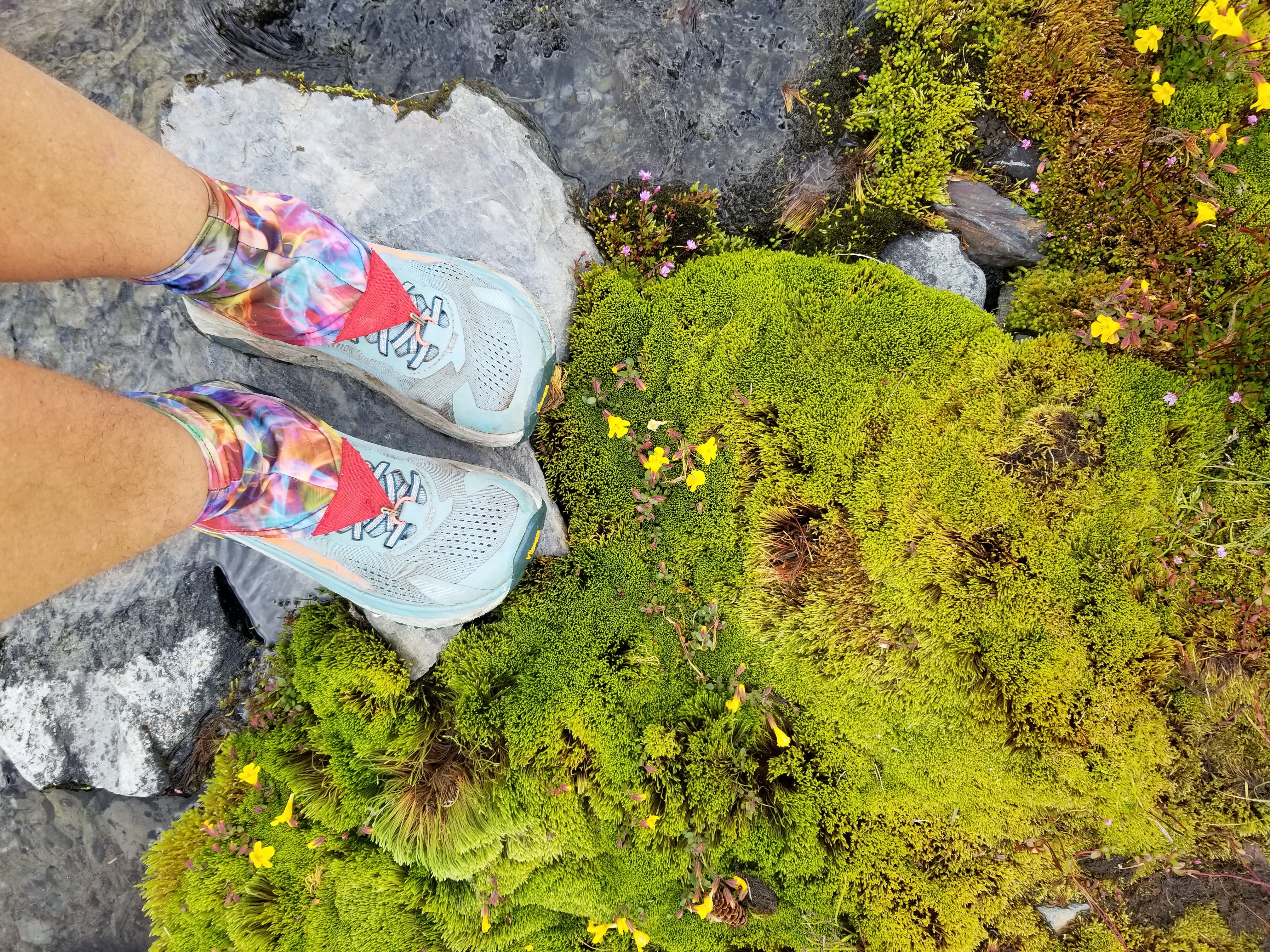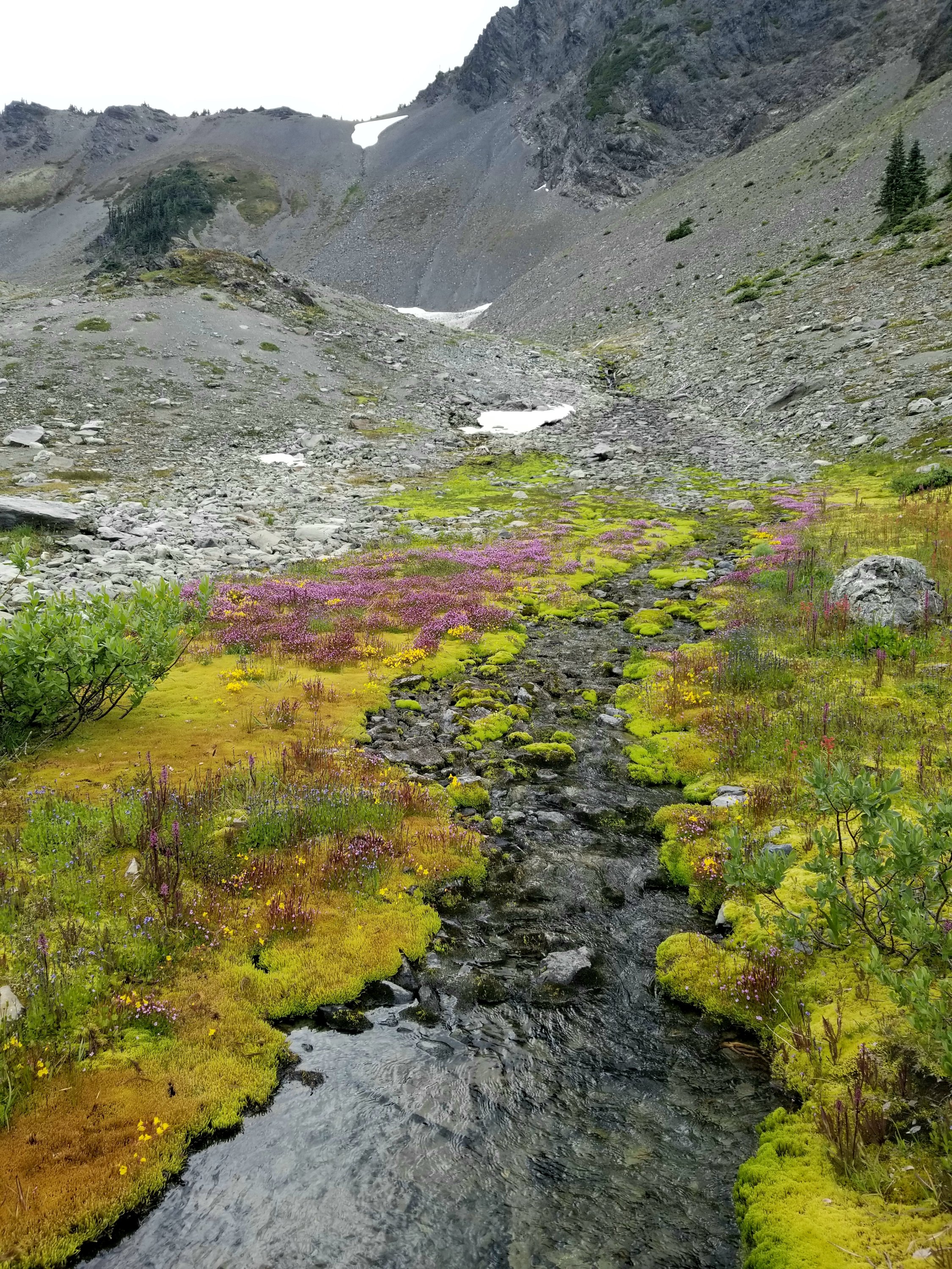 Water is pouring over rocks and filtering through electric yellow moss that is interspersed with grass and wildflowers all clinging to the rock. The ground cover and understory has changed to that of  something hardier and more resistant to weather exposure. This elevation reminds me a lot of places along the PCT in the Cascades. One of my favorite sections of the entire trail. This is wonderful, I am in my happy place!
