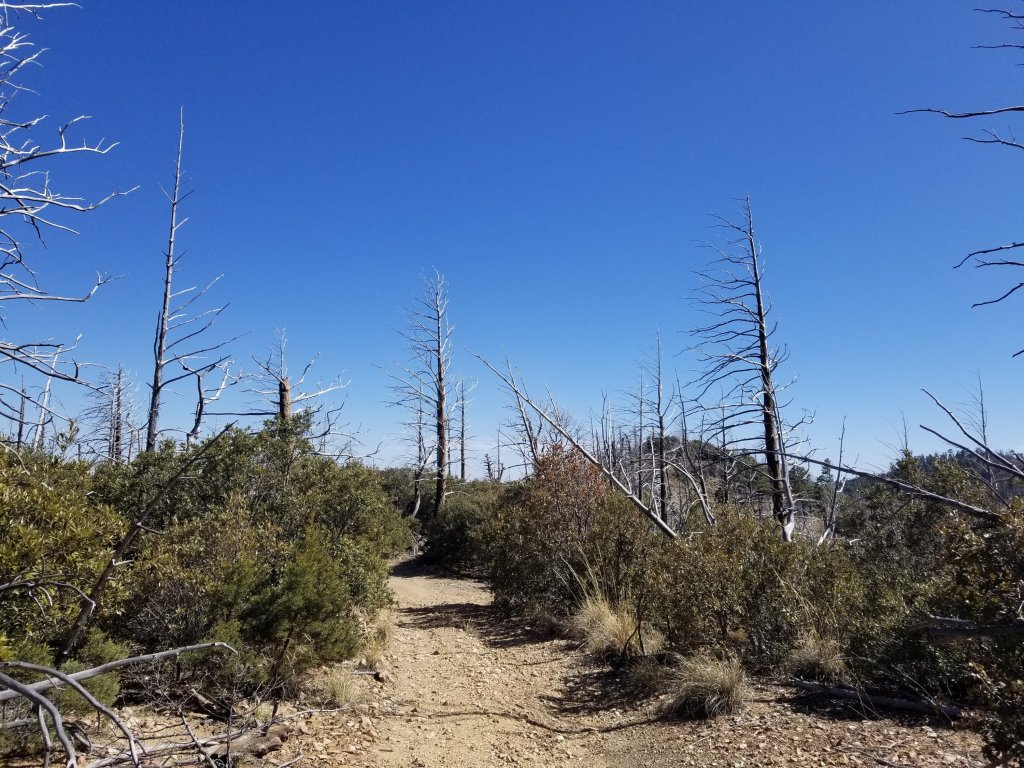 The entire slope here is so damaged by the fires and there are charred downed trees everywhere that interrupt the trail and slash at our legs. We are constantly having to negotiate not only the downed trees but the vegetation that is thick, overgrown, sharp and pokey. There is a little less cat claw however so we are thankful for that.
