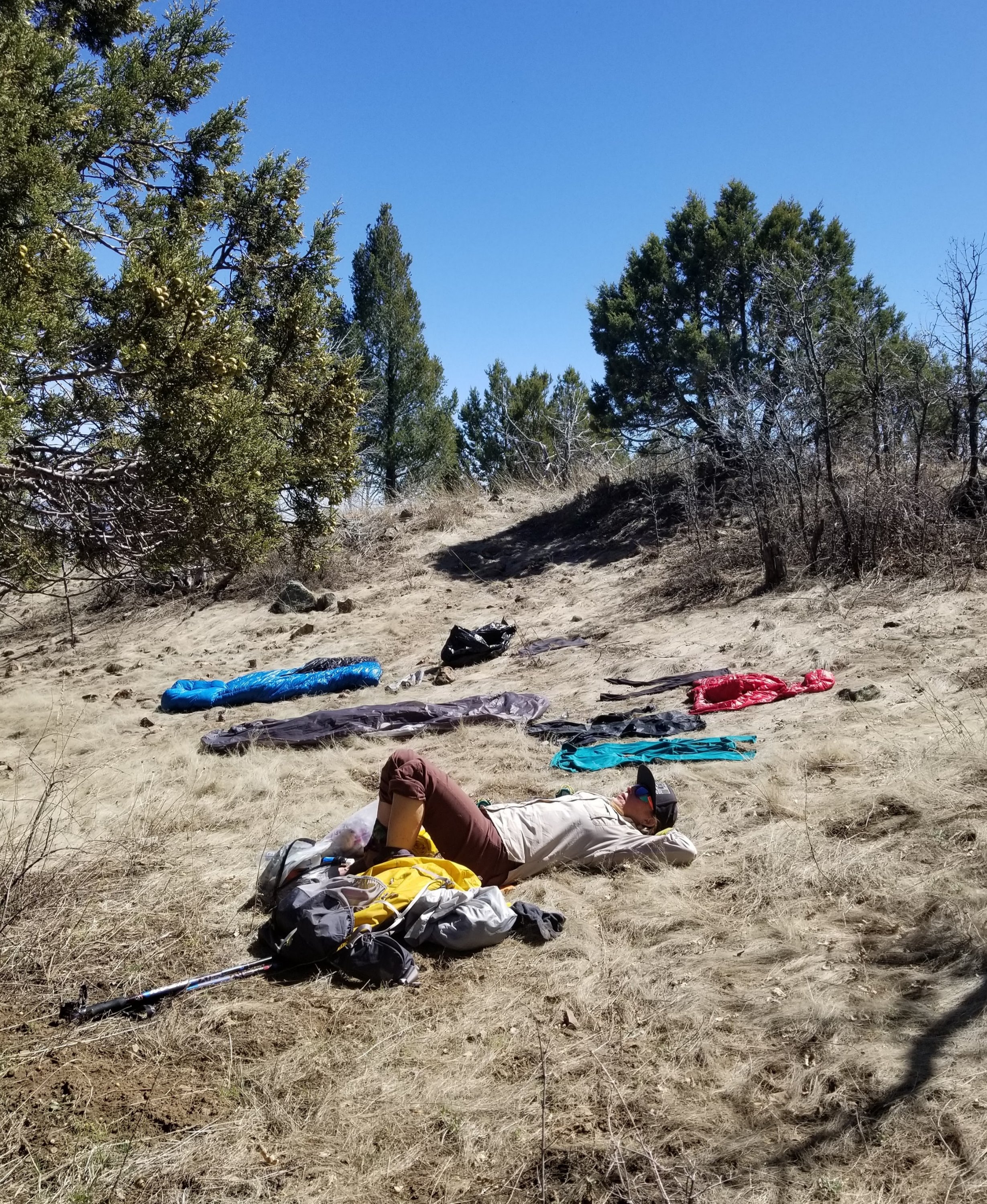 When we reach our lunch spot is is 12:42pm and we are doing really really well. We find a great spot to yard sale all our gear as we need to dry out our tent and sleeping bags and everything. We take over the area and have a nice long leisurely lunch. It is really lovely, we even lay down for a little bit, soaking in the sun.