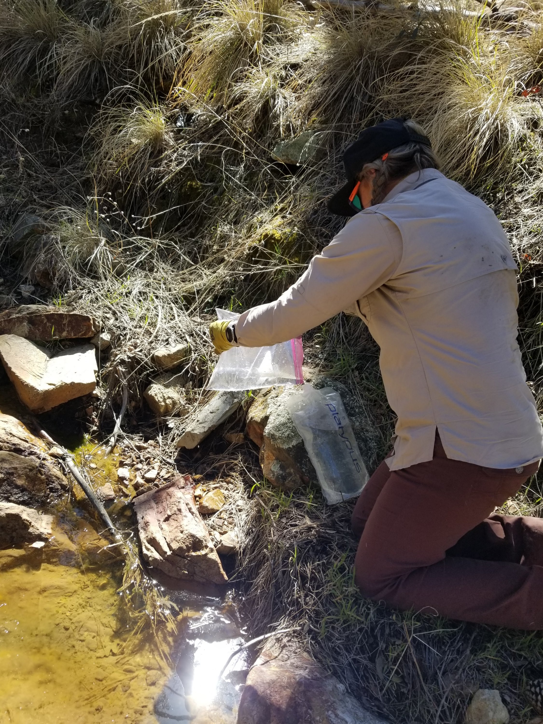 We take off our packs and sit for a short break here as we study the route ahead. We are thirsty so we leave our packs at the trail junction and walk down to the Spring, hoping we will be able to intercept it sooner than 3/4 of a mile and we do. We are able to drop to it within a half mile on good trail and we hit a perfect little pool from which to collect. It is covered in a thin sheet of ice and we break through it and start scooping, It is cold and fresh and perfect.