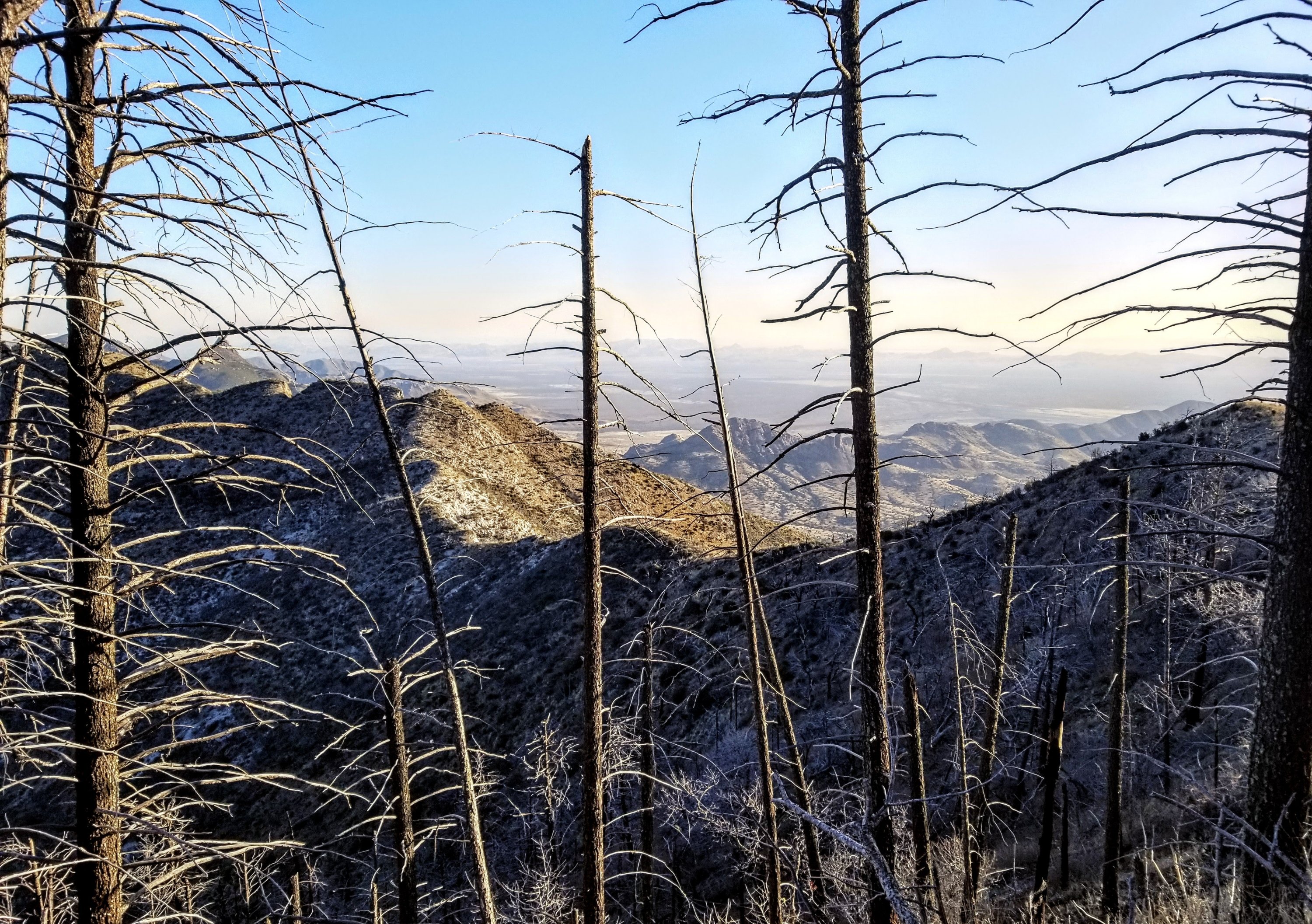 From here we can see the mountains ahead, where we would be traversing had we decided to stay the course. We feel we have made a very good decision not to continue on our original route when we see more burn areas and they are covered in snow. The trail would be climbing up to 9,000 ft and the combination of burn and snow along under used and unmaintained trail, limited and unreliable water access all seems like a bad situation, especially since we only have two more days to finish this thing.