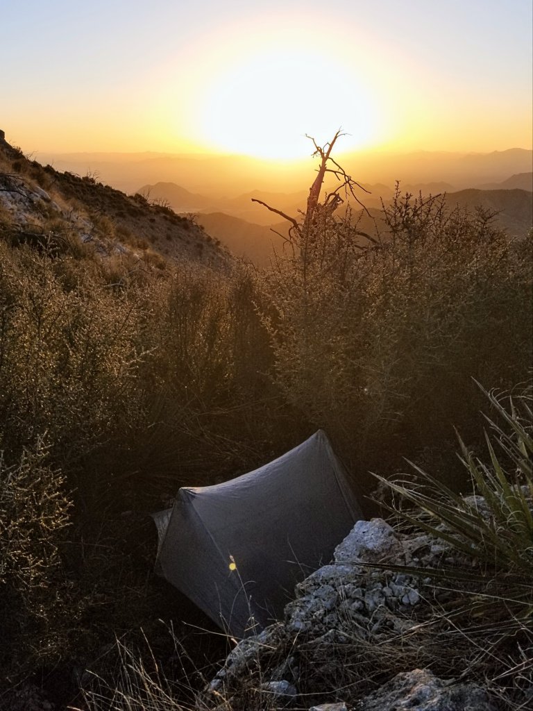 As we are packing up I jump on top of a rock oputcropping to witness the sunrise and try to get a photo of our campsite. There is a lot of smoke on the Eastern horizon and we wonder what fire might be happening and where. It is windy up there so I duck back into my tent and tuck back into my sleeping bag again. We both play the game of waiting until the last minute to get out of our sleeping bags and packing up for good. The rays of light from the sun do help some but we know where we are headed is on the West facing slope, in the shade, and it is super windy out there.