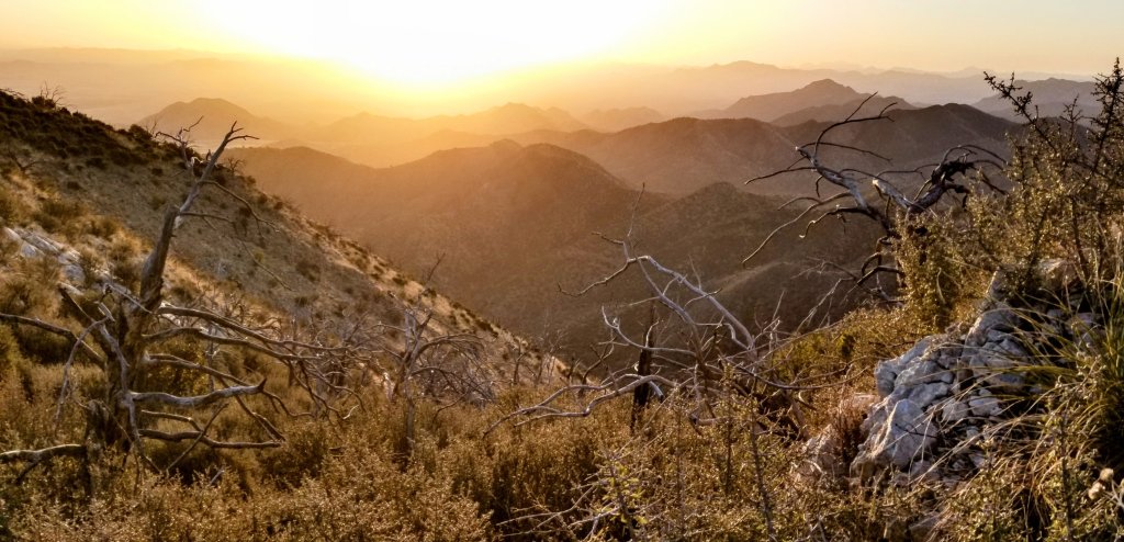 When we pop onto the ridge the going is terrible. Just as terrible as last night except that now we have to traverse a very steep downslope and right off we are in the thick brittle bush and agave that pokes at you with razor sharp tentacles. We make it down to what is supposed to be the trail and start contouring over toward the first saddle that has sunshine.
