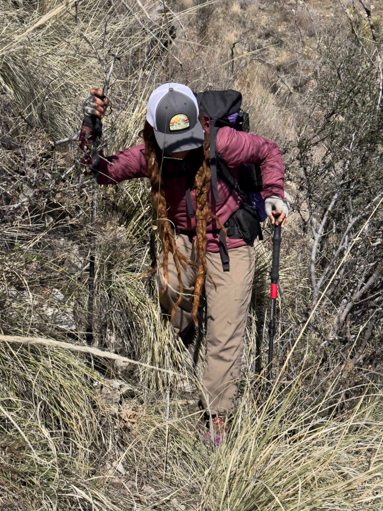 The goal from here is to hike another two mile segment of “trail” to reach an intersection with a 4WD track. From there it should be easier walking, so we make that track our lunch goal and hope to be there by 1:00pm. Thankfully, the trail is in much better shape in this section. Yes, it is overgrown, but with grasses now. There is only the occasional blow down and so much less of the brittle bush, agave and cat claw, so much easier to negotiate. We see a TON of bear scat along this section of trail, I mean so much there were easily 20 piles of scat in one mile. This bear really likes to use this trail.