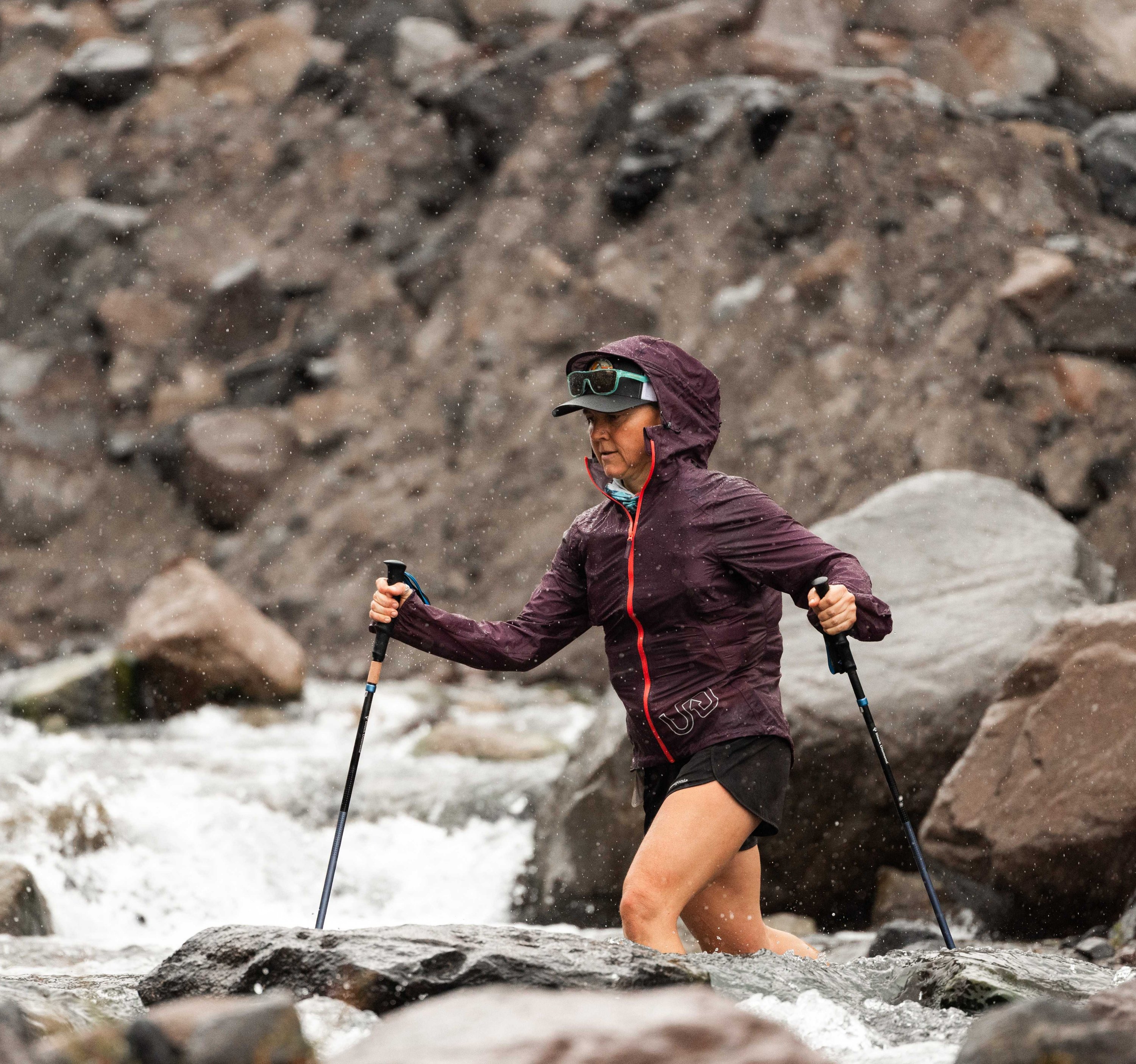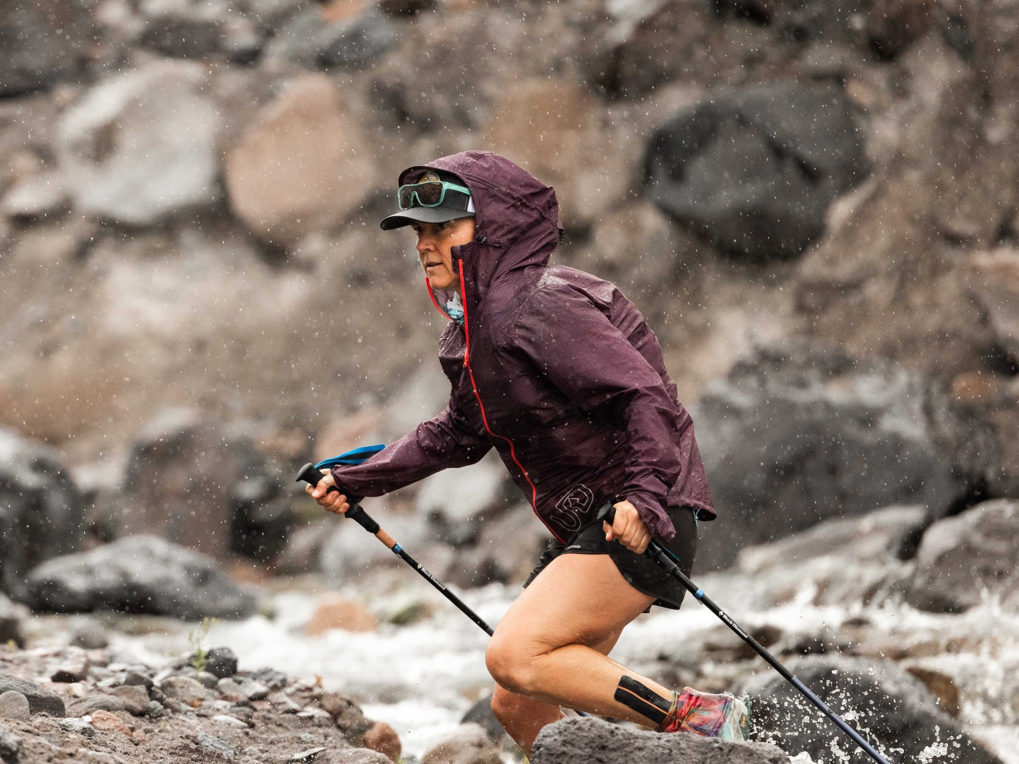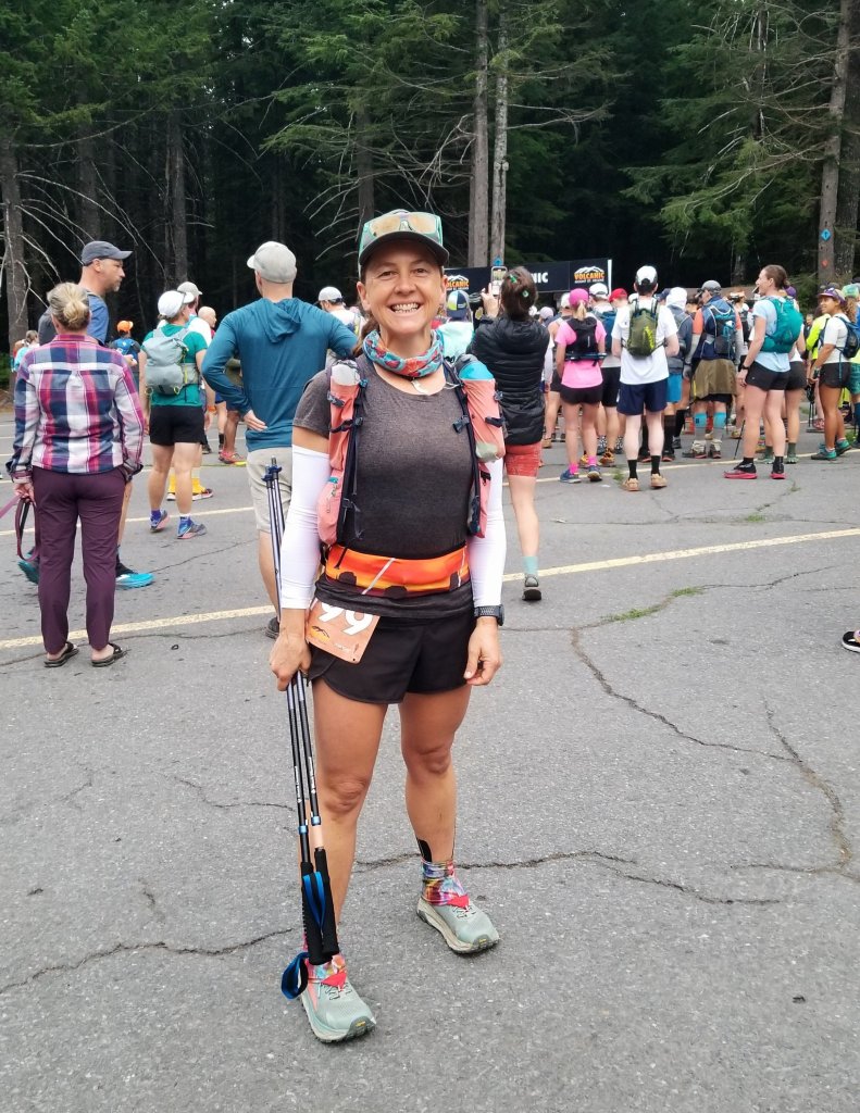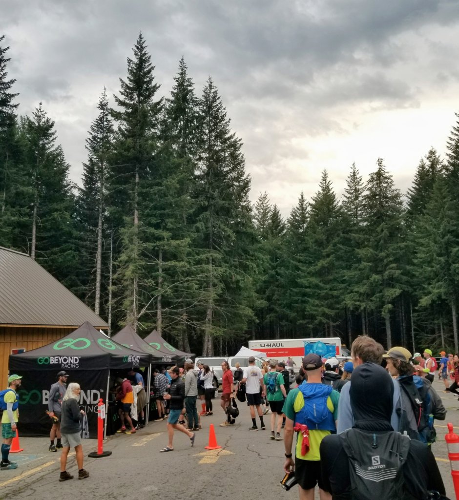 I sling my tried and true faded pink Ultimate Direction vest on my back, I’ve been wearing this thing for the past four years and it’s full of holes, but still serves the purpose. I also have a new UD waist belt where I can keep some extra items such as my map and more snacks. The race has a few required items such as an emergency blanket, storm jacket and 40 oz water carrying capacity. Of course, I add a bunch of stuff and my pack is now quite full. Since it’s raining I decide to take rain pants, a pair of dry socks, compression socks and gloves for added warmth. It’s not all that cold, but I don’t know that it won’t be up on the mountain!