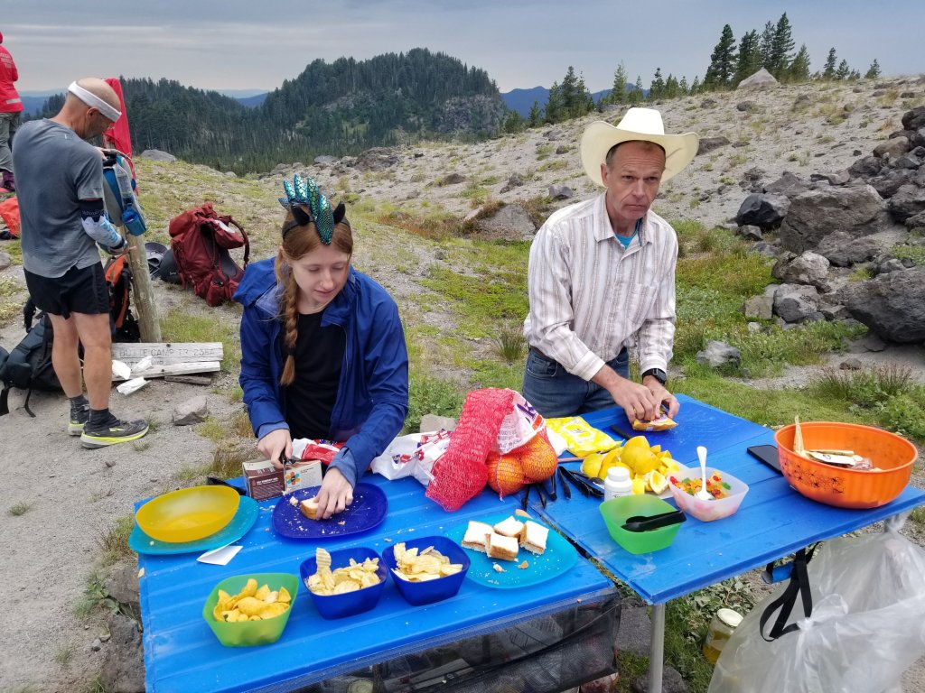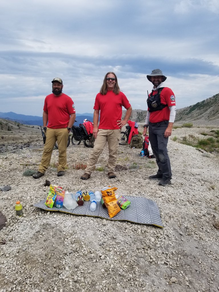 Our next objective in about a mile or so is to cross Windy Pass, one of the higher points of the Loowit Trail at 4,800 ft, it’s about 500 ft of climbing to get up there and I’m excitedly anticipating the views. Not a quarter mile after leaving the Spring Aid Station I see a group of SAR volunteers alongside the trail offering trail magick. What!? Not only did they make the effort to get themselves way out here, but apparently they rode their dirtbikes. So rad. And, it is enough that we get all these Aid Stations, but now this surprise, what icing on the cake. I stop to chat with these three hearty medical volunteers and thank them for their support. They have a sweet little spread of chips and such dished out on a Z-Rest mat, so in order to show my apreciation I help myself to what I believe are the best flavor of Kettle chips out there, Honey Dijon, nice choice guys!