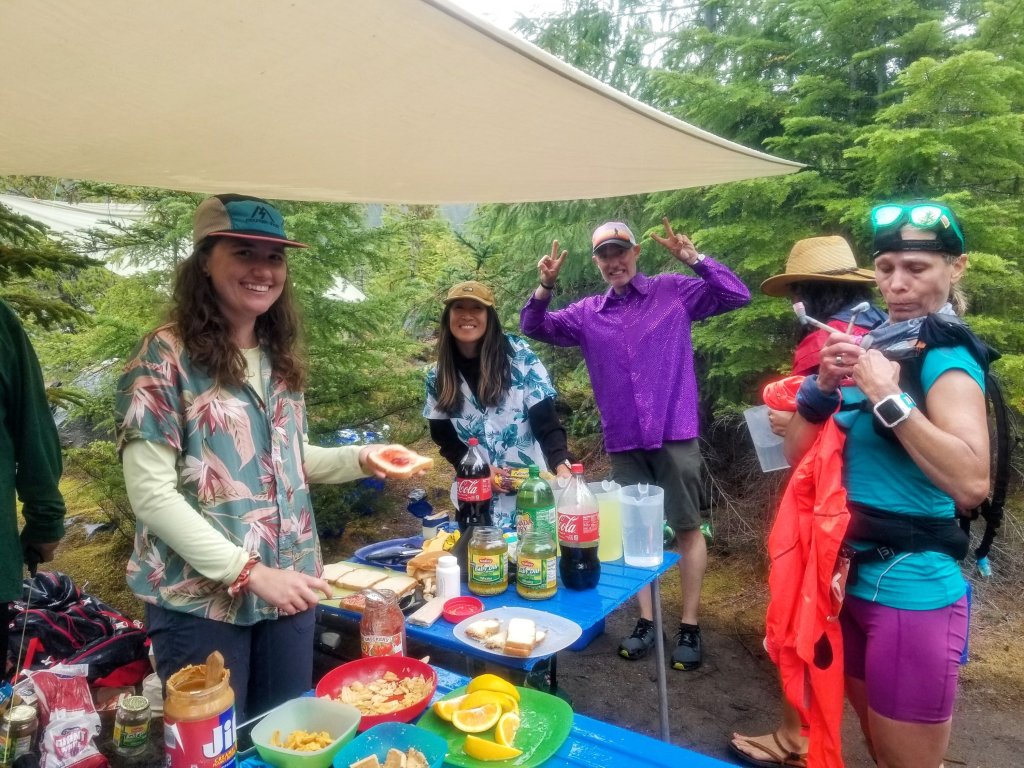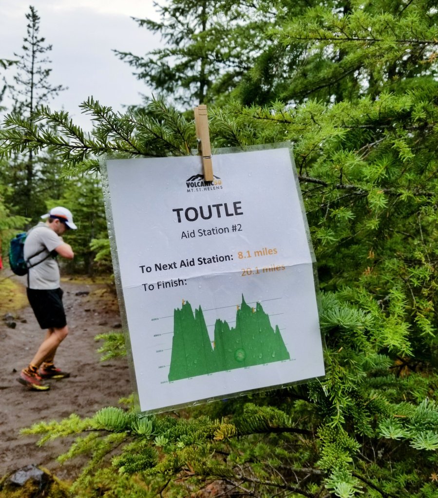 Aid station number two is at mile 12 which means from here we have 20 miles to go. This is the last full aid station until aid number four, so this is where you are supposed to load up on calories. After this is a massive climb back up to the ridge and the next aid is a hard 8 miles out. It is full on raining now as I glide into the Toutle Aid Station.