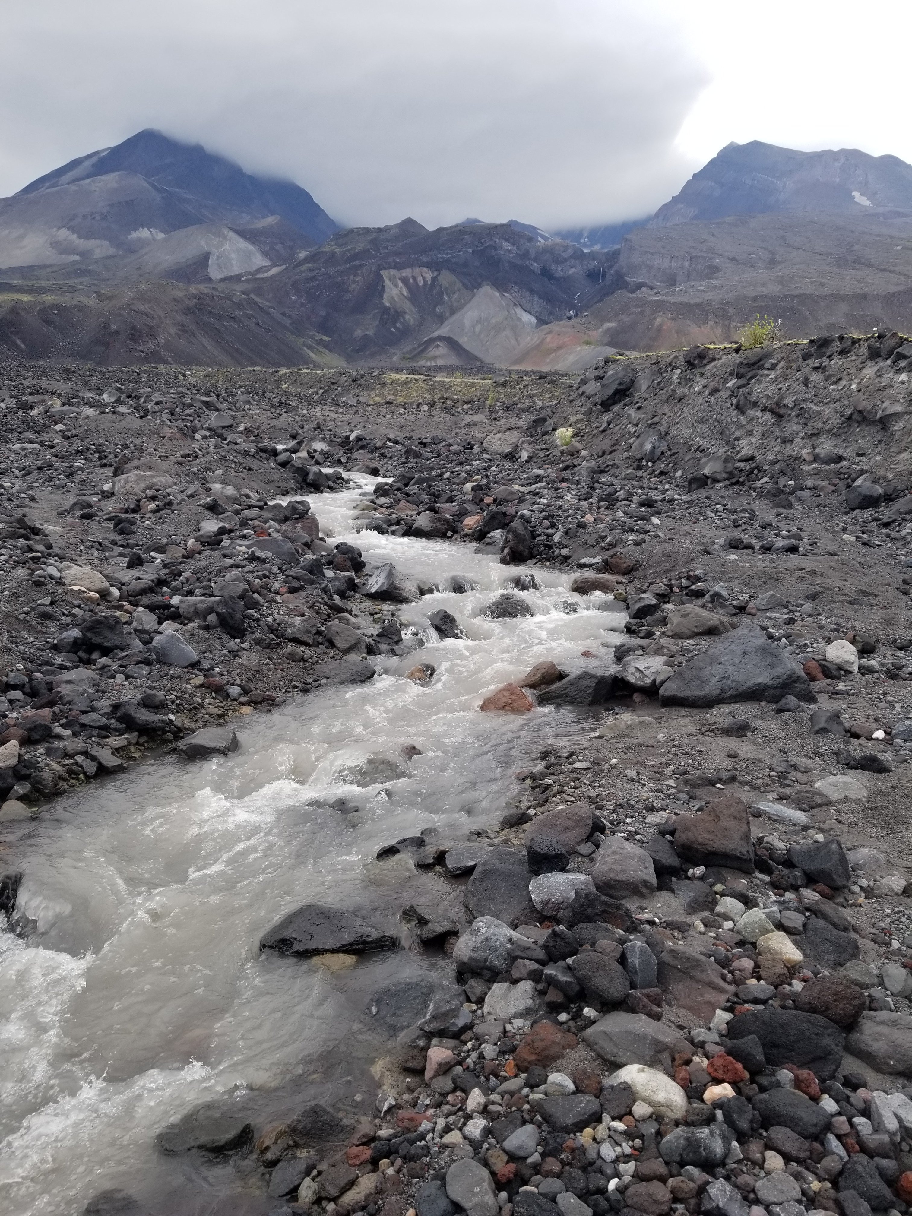 I feel like an entirely new human now and take this opportunity to ditch the jacket as the rain has lightened up. I’m feeling so much better and more free now, released from the shackles, whoo hoo! The trail here continues on a rough contour through the lava and there is a beautiful ochre colored ground cover interspersed among the pumice. The trail undulates in and out of little water drainages and eventually crosses what I believe is Loowit Creek. The water is pure glacial melt and tumbles off the mountain, churning the pumice; silty, milky and damn cold as I plunge in.