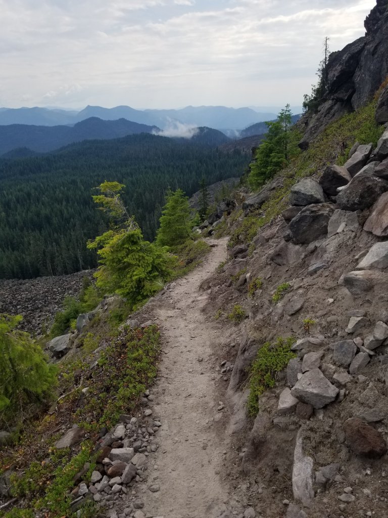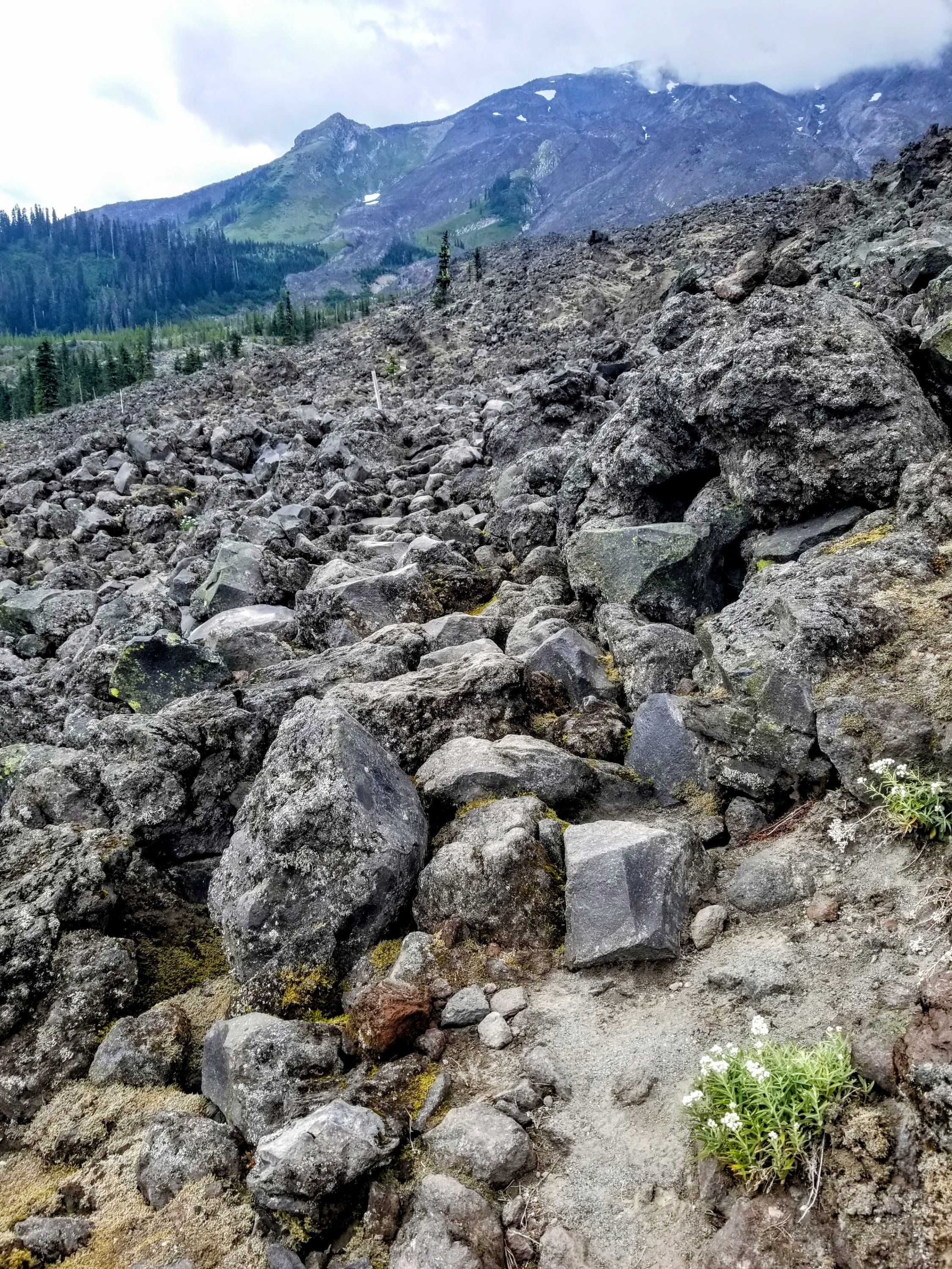 From the river we have now climbed 800+ ft to this ridge. I am surprised but not surprised at how strong my legs feel climbing and realize that perhaps all that steep backpacking I did last week with 30lbs on my back is paying off! The trail levels out and stays roughly on a contour for the next 5.4 miles with the West Dome of St. Helens hovering over to the East. Though the trail is relatively flat, it is still rocky and lumpy and there are a few overflowing drainages with brief water crossings.