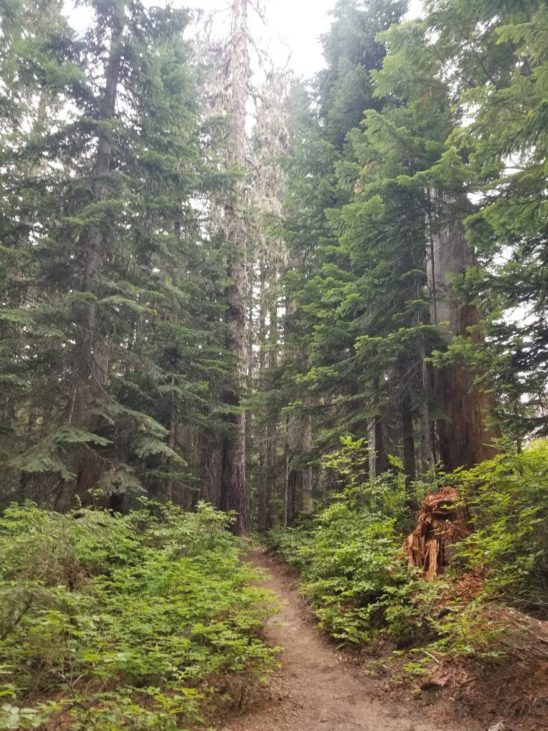 From here the trail follows a contour for a mile or so, crossing the intersection with the Sheep Trail. Eventually we start on the long descent from Cresecnt Ridge through the forest to the Toutle River. This is a notoriously long descent, and now I am moving quite well. I am tracking behind a woman and keeping pace with her and that’s fun. The rain is coming down heavier now and I fight off the need to stop and pee, but eventually I go off trail, loosing her and a few other people pass me by.