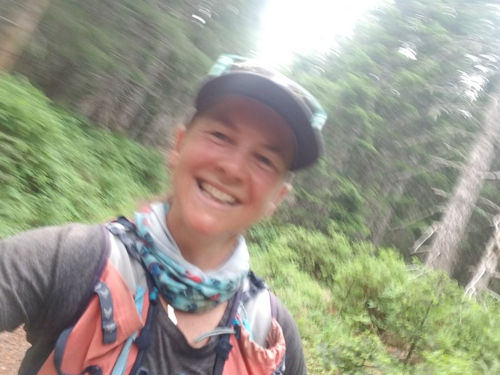 From here we are on a very windy ridge and the rain is still coming down. Nobody puts on rain gear though as it’s just not cold at all. I am getting wet but not drenched. I feel good and press on, surprised at how light and bouncy I feel which is so nice. I feel like today is off to a great start, I hope it stays this way!