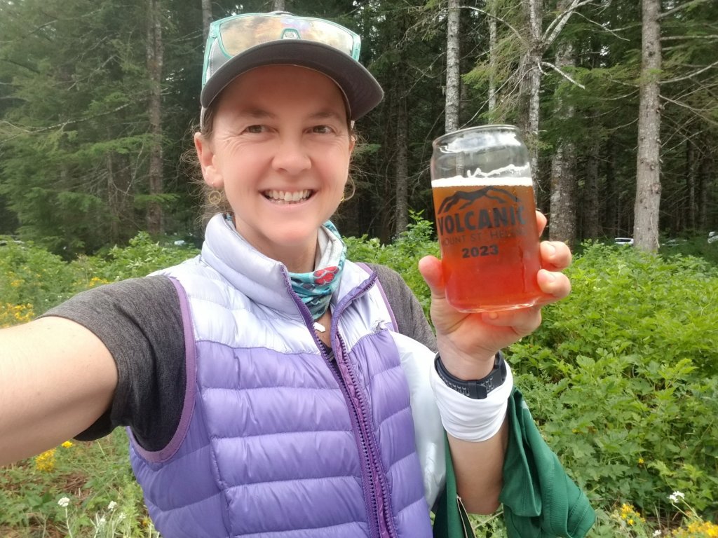 As I cross the finish line I hear the announcer call out “and a very strong finish by Milissa Gillen from Flagstaff, Arizona”. Well how cool is that? I am smiling from ear to ear and am swiftly handed a super sweet pint glass with the Vocanic 50K logo filled to the brim with cold spring water that I guzzle on the spot. I tell you what, that is the best tasting water ever! What a wonderful race finish treat!