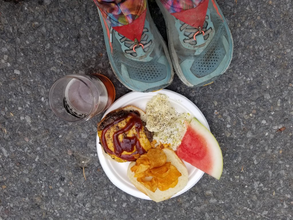 It feels really lovely to sit down after the race with someone who also just had their own experience out there on that magical mountain. The conversation is compelling and encouraging and we continue to share stories over a burger and for myself, a beer, provided by the race organization. I have my plate loaded with a giant burger complete with BBQ sauce, cheese and the works, with a fair helping of potato salad, watermelon and an iced cold IPA in my pint glass. Wow does this hit the spot!