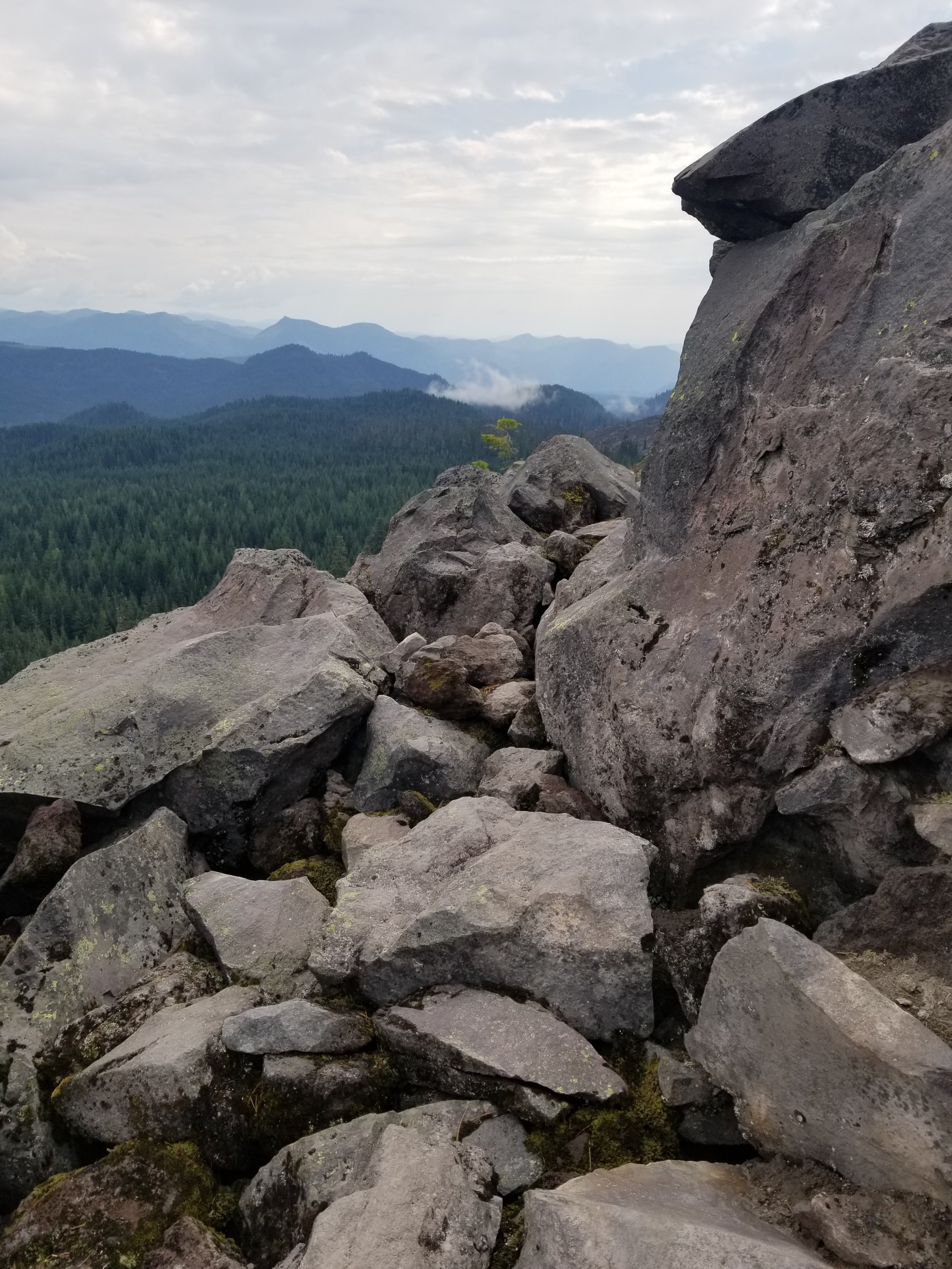 Between the first and second aid stations is a distance of 6+ miles and varying terrain though it’s less climbing than that first six miles. The trail undulates along a contour through sections of forest and more trail amidst some boulders. I see wildflowers such as lupine and paintbrush appreciating the vast expansive views. Even though we can’t see all that far, there is still a beautiful swath of thick green forest in the distance.
