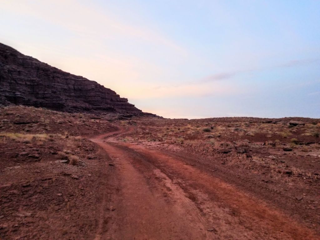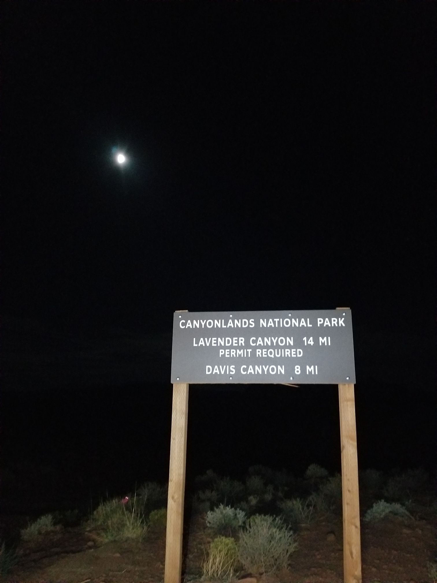 After a few good miles on pavement, the trail veers off to the right, passes through a gate and we are back on dirt. Here we enter Canyonlands National Park heading South toward Lavender Canyon. By 10:00pm we are moving well still, we travel along a dirt track that eventually turns into a wash. As we enter the sandy section we notice there are some spindly trees, perhaps in the willow family or similar.