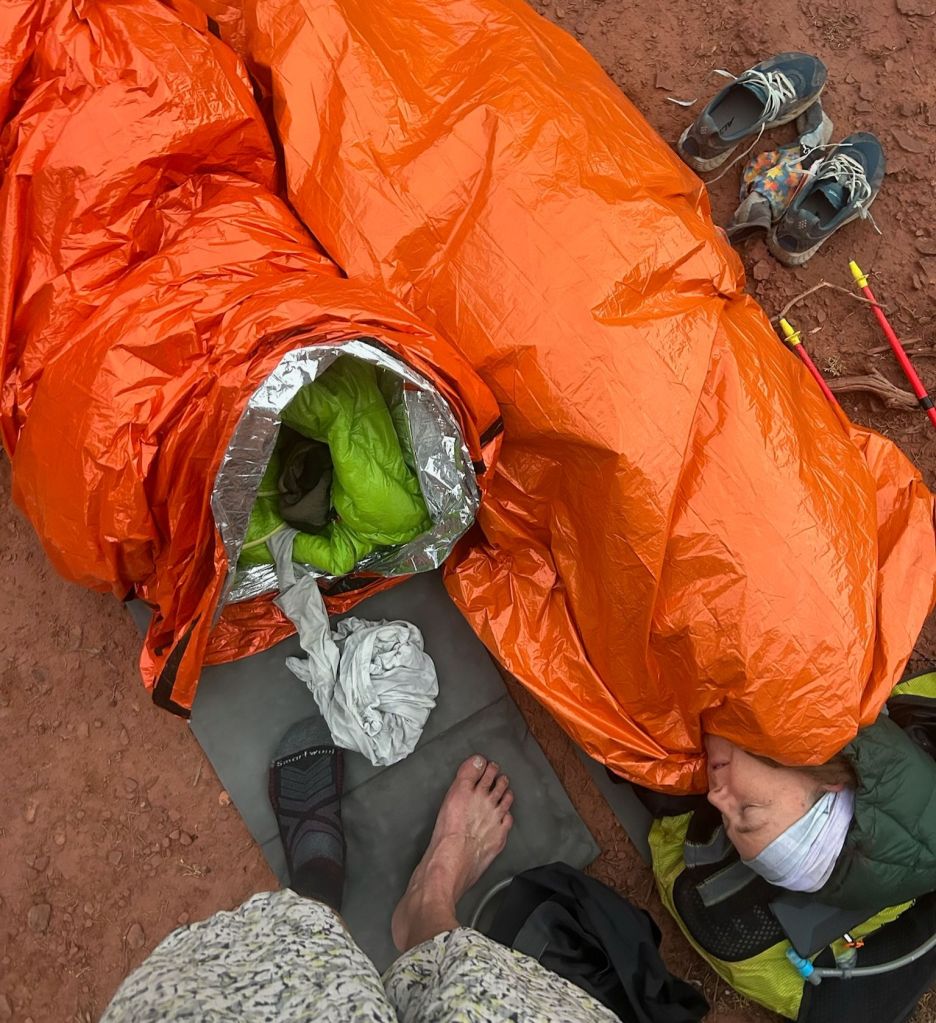 As the good partner that he is, he agrees to let me get some more sleep so we scout a spot. It’s nestled among a small stand of Junipers close to a ledge. It feels somewhat protected and enough off the trail that we won’t be bothered. This time we change into full sleep mode. We remove our sweaty clothes, put on our base layers, puffies, socks and beanies and tuck into our SOL emergency bivy’s.