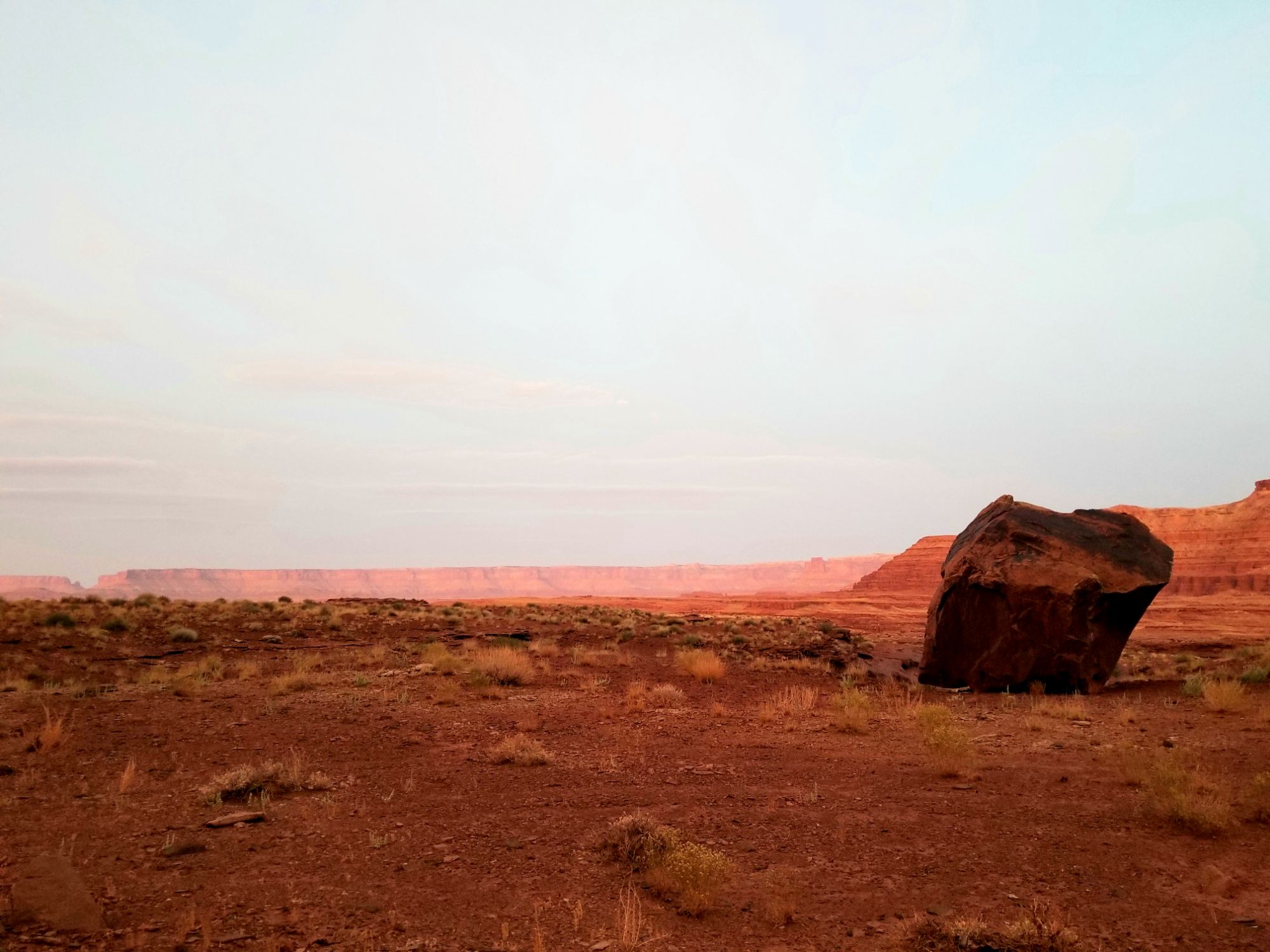 I reflect on times I have greeted the dawn from deep down in the Grand Canyon which this landscape reminds me of. There are towering walls of red and pink rock to my left with beautiful layered formations, and to my right, an open expansiveness. The light is pale pastel and the world holds the stillness of morning. I am but one small figment of existence, a tiny little dot moving through time and space. I am right where I need to be.