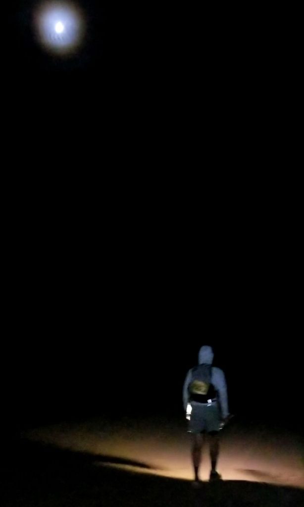 We leave the aid station following along a dirt track for a spell then hit some pavement just as darknesss is falling. The moon is growing in brightness as she ascends into the peak of the night sky. Shortly we need our headlamps and Kogalla set ups so we stop to put them on.